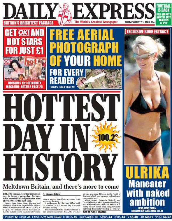 The BBC and Sky’s news sites have warned the public not to go out for fear of death by extreme heat! What the… ‘Extreme heat’? It’s a cloudy, windy, dull 24C.Radio Four is informing the public to wear a sun hat and cover oneself in sun block for fear that there will be a repeat of last weeks 5,000 reported cases of sunstroke.5,000!In Paris last week it was 42C Can you imagine the Brits in Paris? they would have all melted I bet!So am I the exception? Well more accurately are my family the exception? My dad loves the sun, he is currently in Turkey where it is approaching 50C and he is loving it. He is also the only person I’ve ever known to get a sun tan on the soles of his feet! I remember my sister rubbing cooking oil on her stomach to sun bath in our garden.I do not think it has ever been hot enough in the UK for me to moan about it being ‘too hot’.Yet The Telegraph’s website today reports:Hottest British weather could bring highest temperature EVER!