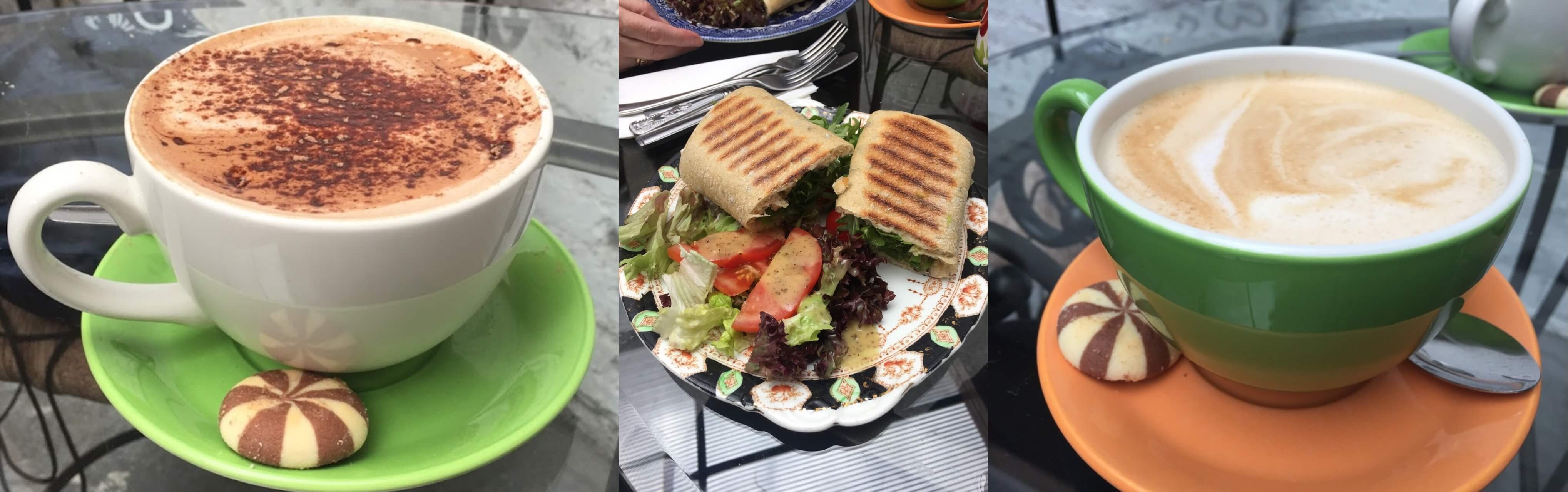 But that said, they were really big cup and came with a macaroon or two. Nice little detail. All the cup and saucers are a random mis-matched collection.The food isn’t small either, a simple Brie and Tomato Foccatia came with a well dressed salad.