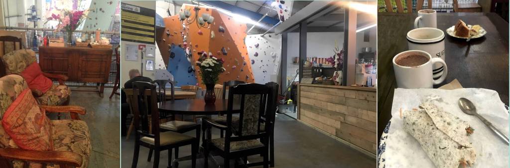 It is odd that you have to walk through the coffee shop, and through a gate in order to get to the boulder area.