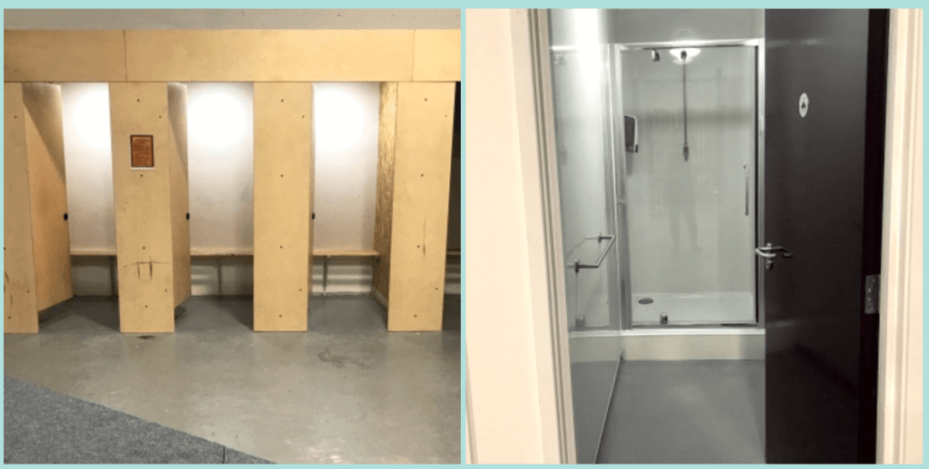The changing rooms are pretty basic, just simple wooden cubicles, the toilets however are way nicer and we would recommend going in there to change, less chance of splinters! The showers too look pretty snazzy, but we didn’t try ’em. Another trek across the mats to a hidden flight of stairs and a gym area that looks down on one of the main rooms and a good place to warm up and stretch. The weights and stuff is a bit basic, but it’s a Climbing Wall, not a Gym, you’re there TO CLIMB!