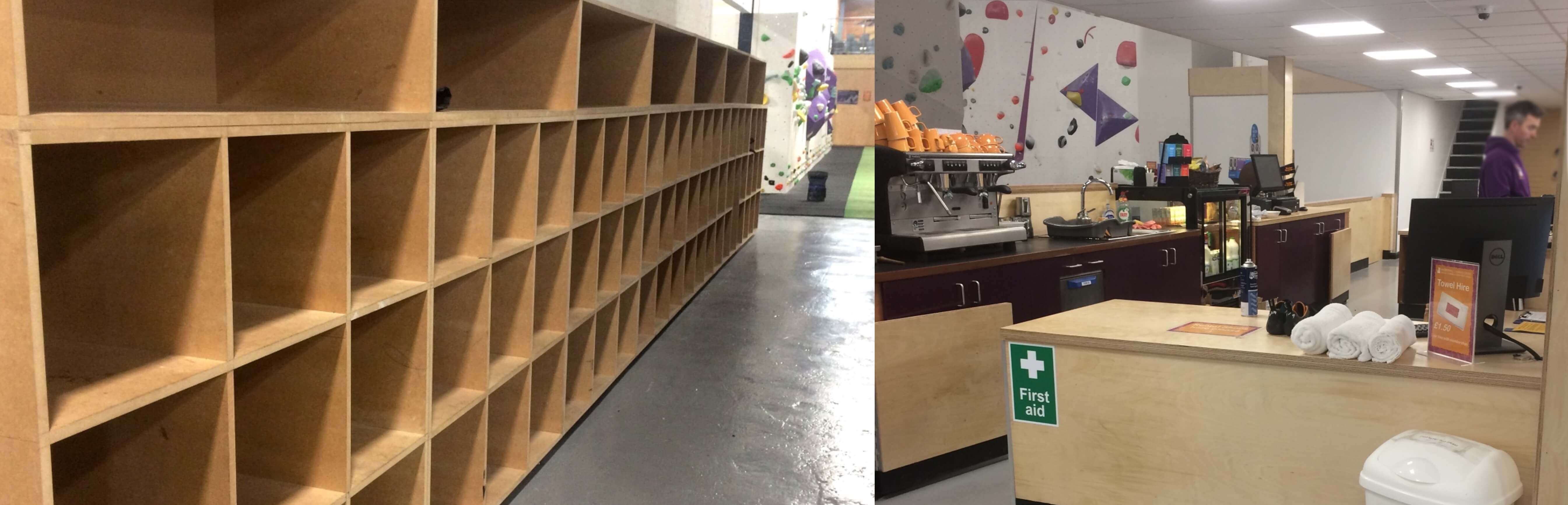 The changing rooms are pretty basic, just simple wooden cubicles, the toilets however are way nicer and we would recommend going in there to change, less chance of splinters! The showers too look pretty snazzy, but we didn’t try ’em. Another trek across the mats to a hidden flight of stairs and a gym area that looks down on one of the main rooms and a good place to warm up and stretch. The weights and stuff is a bit basic, but it’s a Climbing Wall, not a Gym, you’re there TO CLIMB!