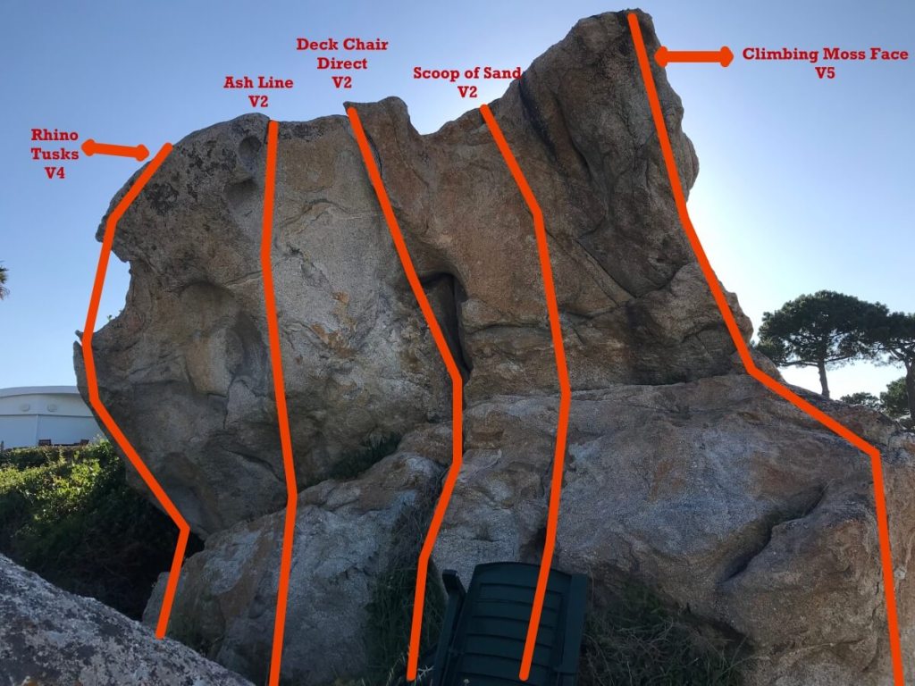 This is one of our finds, it didn’t show up on any website until now maybe? On the beach of San Ambroggio are a few boulders, most are only a couple of metres high and only have a few short routes to play on, but if you start sitting on the sand and climb the eliminate route they are a bit of fun. But there is one big boulder near the marina that is worth a visit if you are in the area. Being as it is only one big boulder it seems that no one has of yet listed Marine de San Ambroggio on the UKC site, so we have taken on the task and listed the crag on the site and are currently awaiting it going live, in the meantime here are our routes.