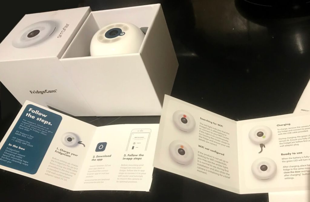 I had seen adverts to for this Fridgecam by Smarter selling you fantastic ideas! It was a small Camera that you fitted inside of your Fridge that would take photos of what was inside, You could scan barcodes of all products that you would put in the fridge and in doing so you would receive notifications when the products expiration date was getting near. It would also tell you how much of a product you had left or needed to buy more of. Plus helpful recipes for the expiring products.