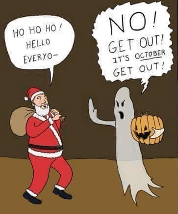 Sure I get that it does take some prior planning to buy presents, to get the right turkey (or tofurkey) and how to get Aunt Mavis from the station the day before, but does it really have to all planned in Spring? or even in Summer? Can’t we get through Halloween and then move on to the next Holiday?