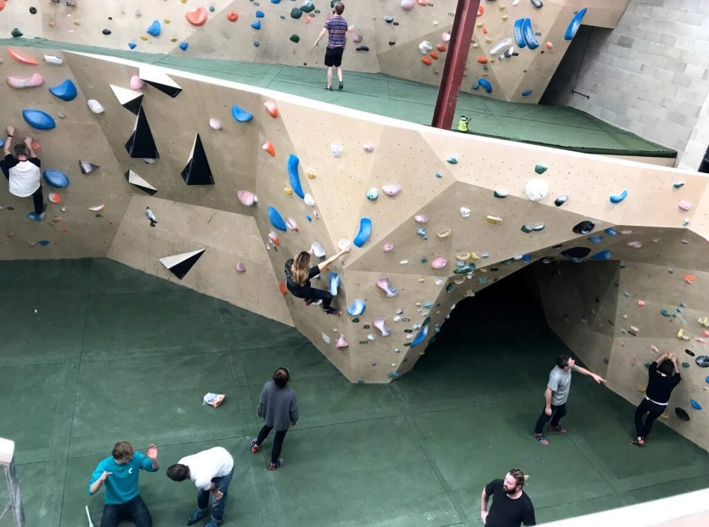 We climbed on a Monday afternoon and this usually means a couple of students and the freelancers taking an afternoon off of sitting around thumb twiddling between jobs, but Yonder on a Monday PM is busy, the Café is busy all the time, groups of non climber sit and chat, there are offices all around the top tier and many workers milling about. But also a lot more climbers, including (much to Ash’s Fanboy excitement!) Michaela Tracy member of the British climbing Team and Louis Parkinson who was there Route Setting and taking lots of Selfies!