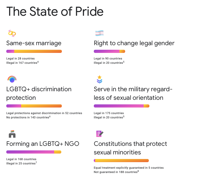 The LGBTQIA community have taken huge strides in progress but there is still so much to do, so much to change and so many people to educate. I don’t mean that in a hurtful way but it’s 2019 people! Acceptance and ‘love is love’ should just be the norm. As of 2019 this is the state of pride as shown by google.