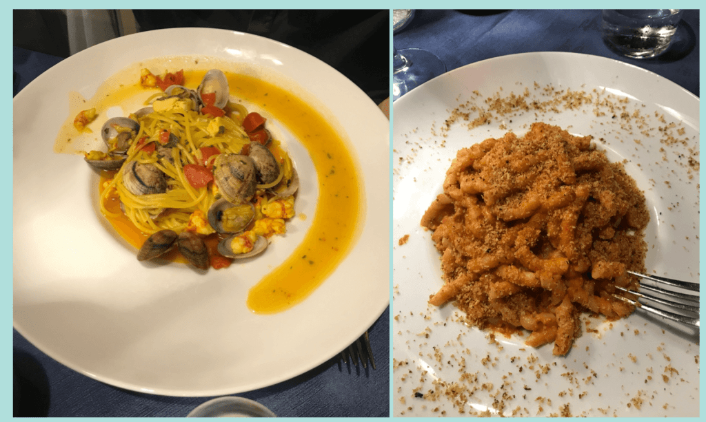 We did eat in the hotel’s restaurant one night, it was well adorned and sophisticated, the prices were a bit higher than we had got used to at John’s and the other places around, but we sat, sipped the local red wine and Bob actually got a choice of two vegetarian dishes, rather than the standard one in all other restaurants. Ash had the Seafood pasta and Bob chose a Almond breadcrumbed tomato pasta. When the food arrived it looked well, it looked fairly small, typical Corden Bleu dishes. We ate and were shocked at the bill – we were charged €5 for not being a guest of the hotel and we later discovered many restaurants in Sicily charge you €5 for the cost of using their cutlery and plates, to clarify, you get charged to use their plates, so if you turn up with your own dishes and knives and fork you could save yourself €5 a time!