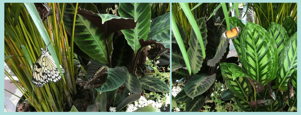 It was pretty cramped inside, with various humans and children stopping and pointing out all the various shapes, sizes and colors of Butterflies. There was a small map pointing out the different sections. As you were walking around tropical plants, trees, flowers, orchids and then a table of yummy fruit “The Butterfly Banquet”.