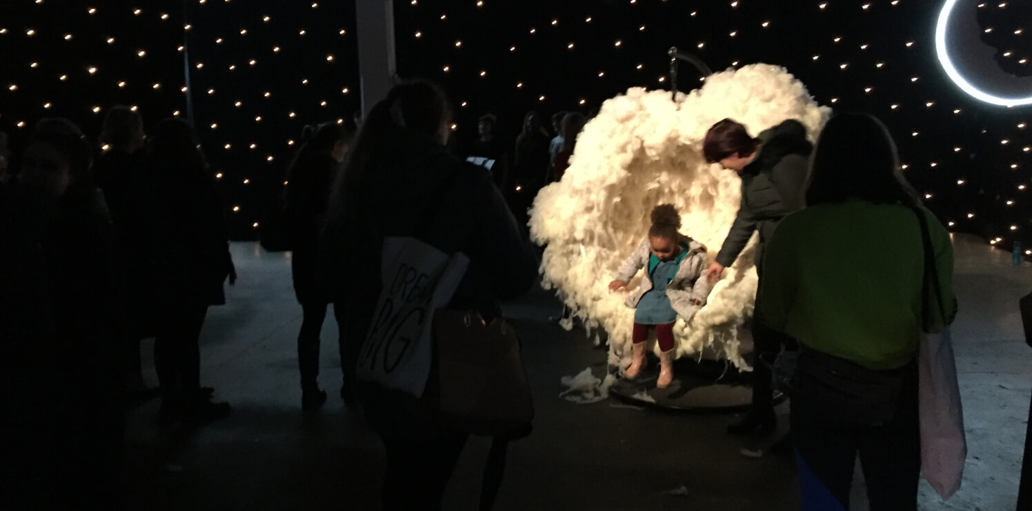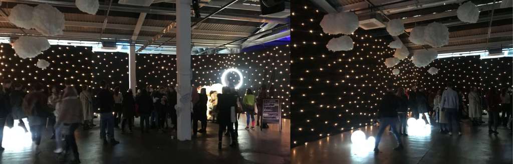 Nothing, a huge room filled with glowing seats, fluffy clouds attached to wires hanging from the ceiling and white walls draped with black curtains with fairy lights giving the impression of a nights sky.
