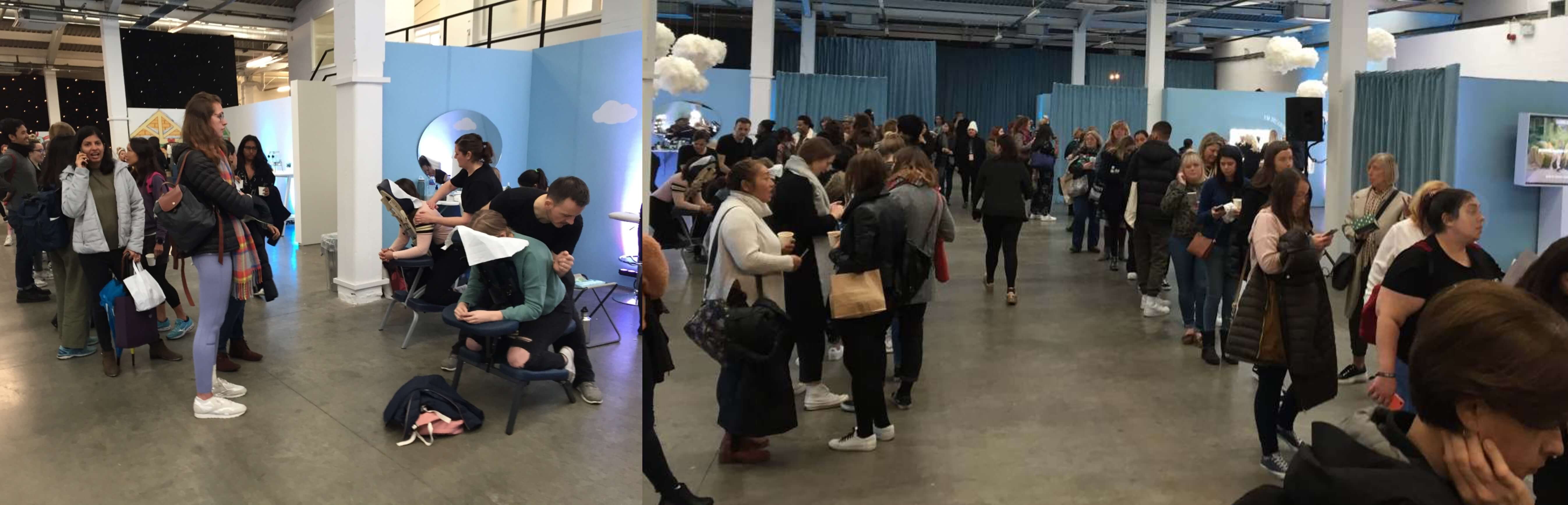 There was one long queue for two seats where you could receive a 10 minute back rub by two people who didn’t seem to know where they were of what event they were at.