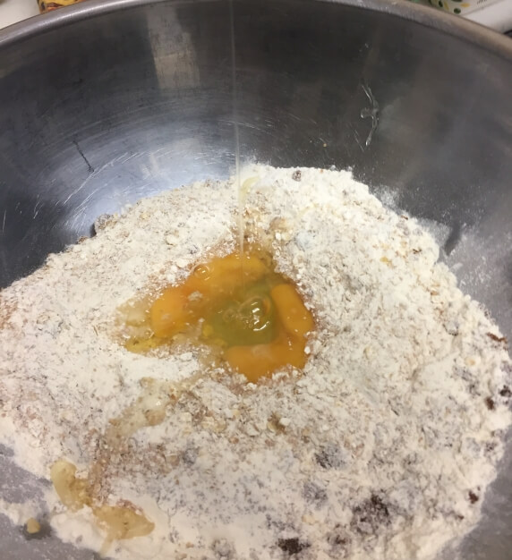 In the bowl mix together the dry ingredients – Bran, Flour, Sugar, Powders and Salt. Then make a well in the middle.
