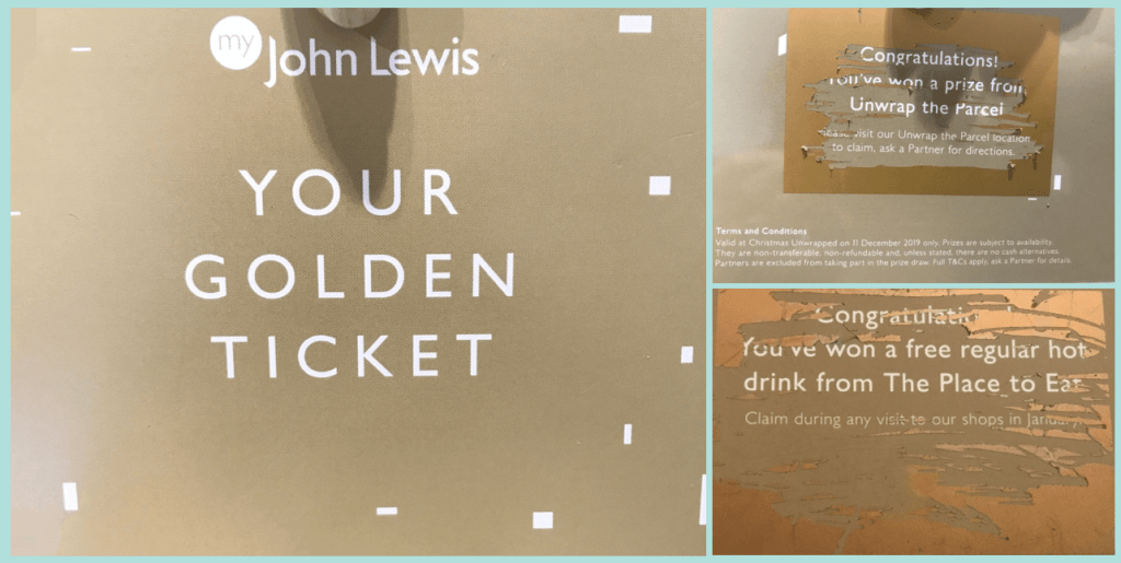 We went to one of the sections where we actually needed a product and took it to the check out to pay and receive the special Golden ticket. The member of staff scanned the barcode asked for payment and then refused to give a Golden Ticket, first stating you had to spend over 50 pounds, then after hesitating for another excuse came up with it had to be in the Christmas section. After showing him the email and pestering him until he relented, John Lewis, if you’re going to advertise something at least make sure your staff are briefed. He finally gave us the ticket and we won…..