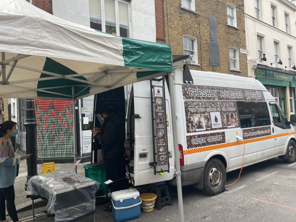 But that’s what happens if you go down to Hoxton Market on a Saturday, there is indeed a man standing (usually) in a Military Uniform at the back of a Transit Van, with a coffee machine loaded in the back. We have been past a number of times, but never dared to try the coffee proffered by him, but the other day we happened to stop next to said van and he asked the question.