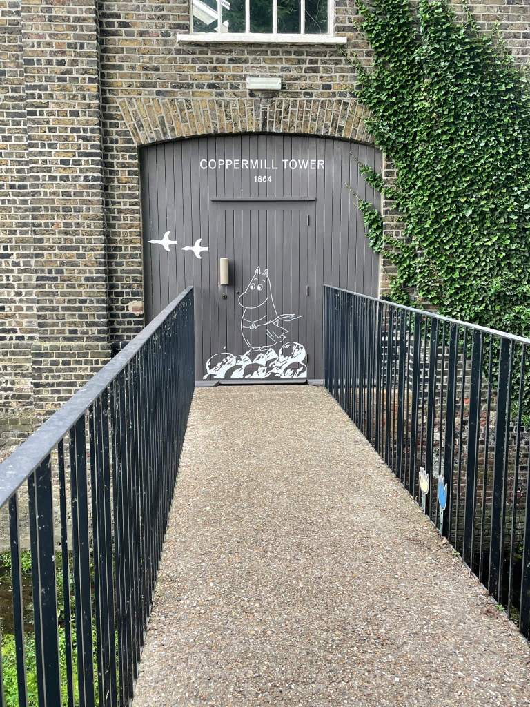 We kept walking and by chance – looking around we spotted the Coppermill observation entrance and noticed Fillyjonk hiding in the corner of one of the arches and to the side a small illustration on the door – we had bikes so we couldn’t enter.
