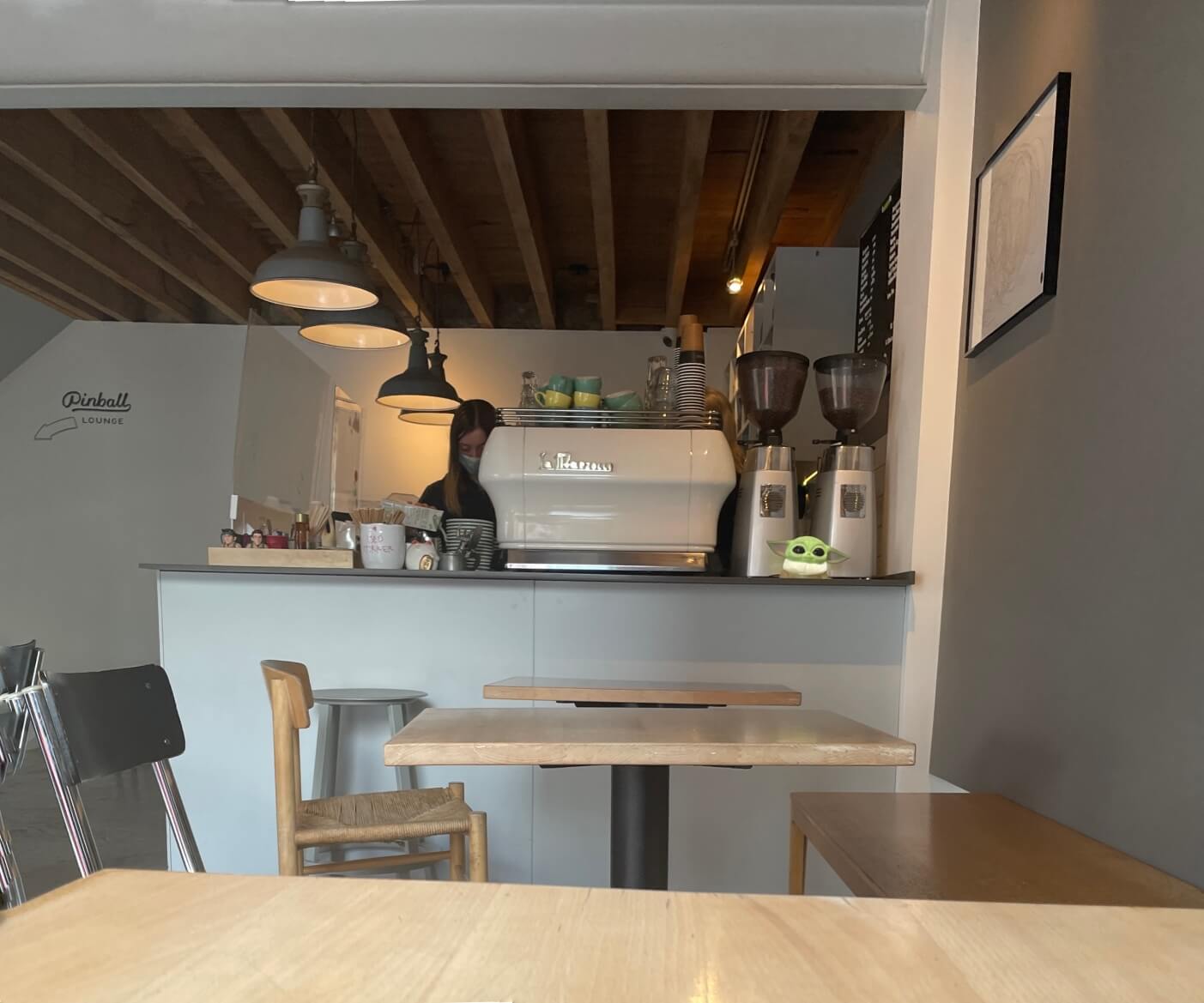 We only stayed on the middle level and didn’t head down to the Pinball arcade or up to the Japanese arcade so we can’t comment on them – however the middle section/coffee shop was minimalist with light wooden chairs/tables.
