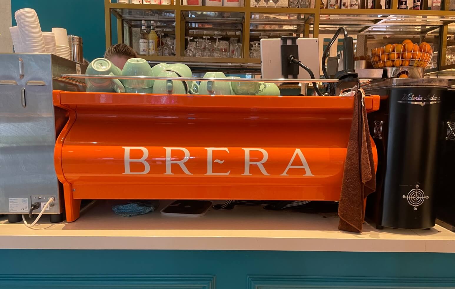 Whilst hiding from the rain around Canary Wharf we decided to get a Coffee – We looked for ages but eventually saw the bold colors of Brera and decided to grab one there.