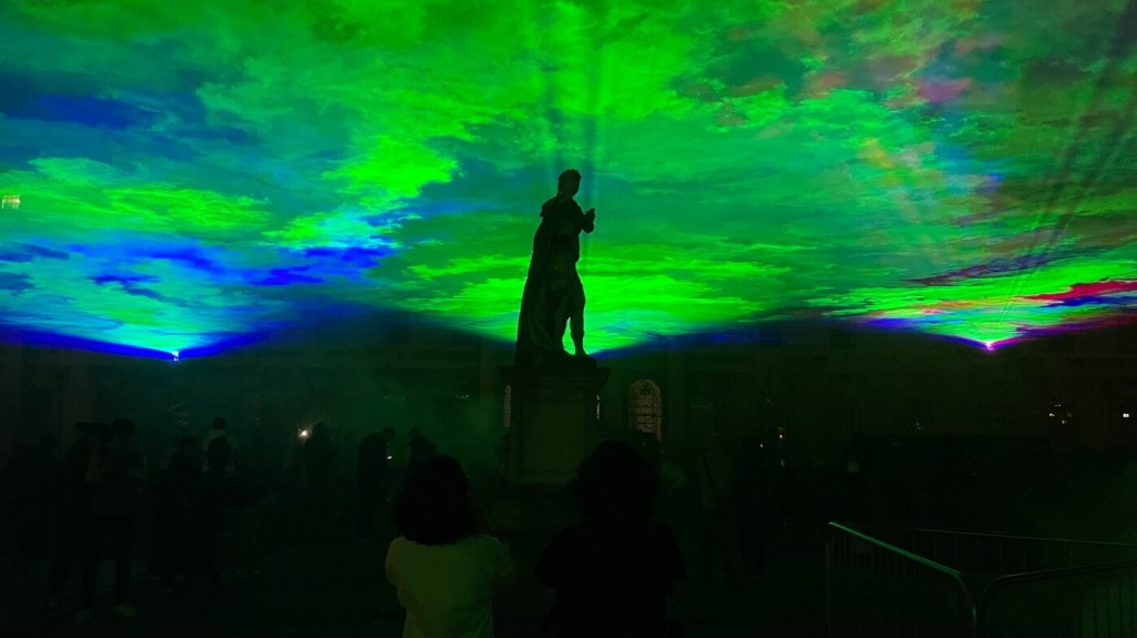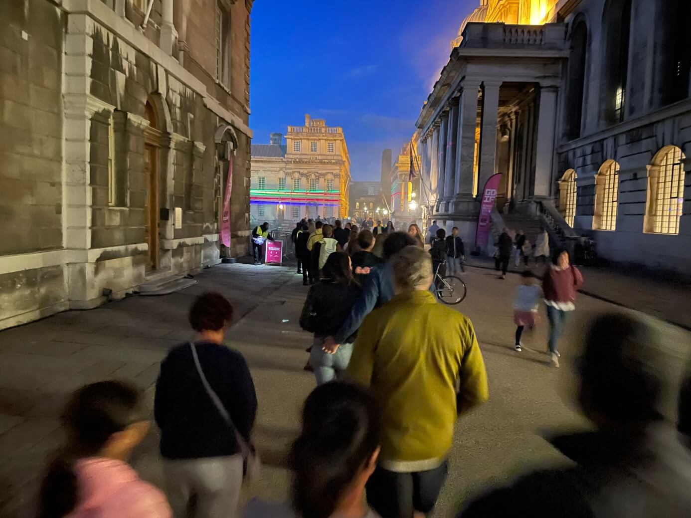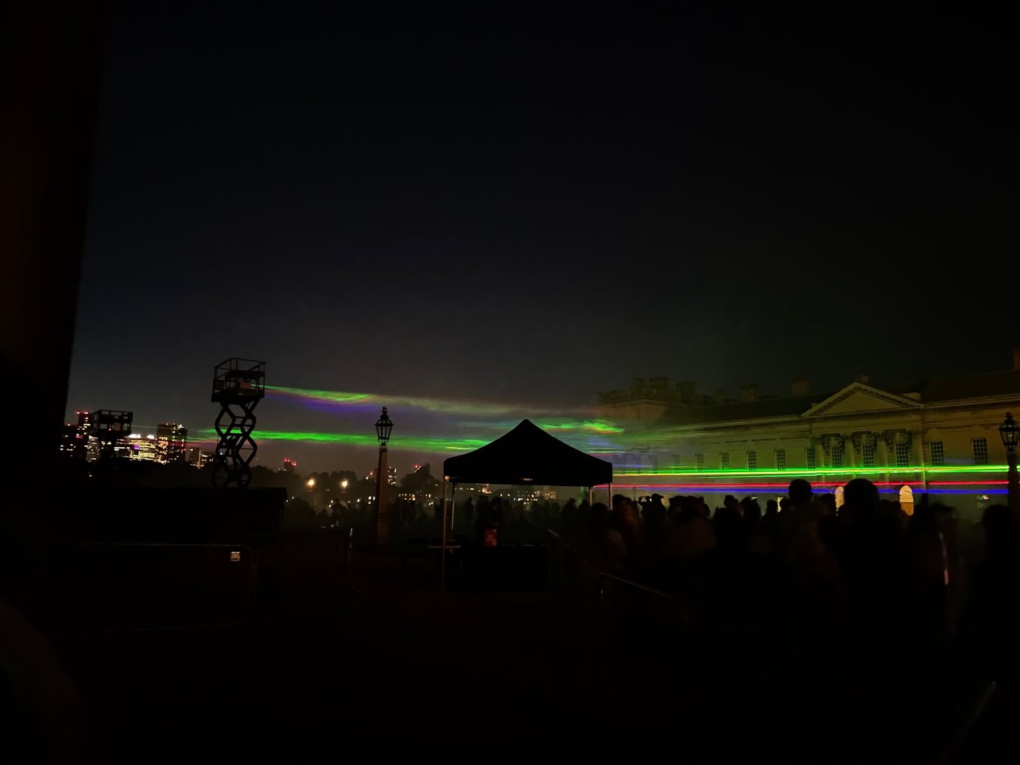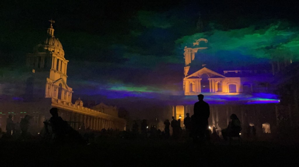 Greenwich may be the centre of time on this planet, but it’s not far enough north to experience one of the great natural phenomenons of the planet, that being the Northern Lights or to give them their posh name the Aurora Borealis, but currently (The end of August/start of September 2021), we got to experience something pretty close. As part of the GDIF an Installation by the Artist Dan Acher (pronounced: Asher with a French accent) brought Borealis to the grounds of The Greenwich Maritime Museum.