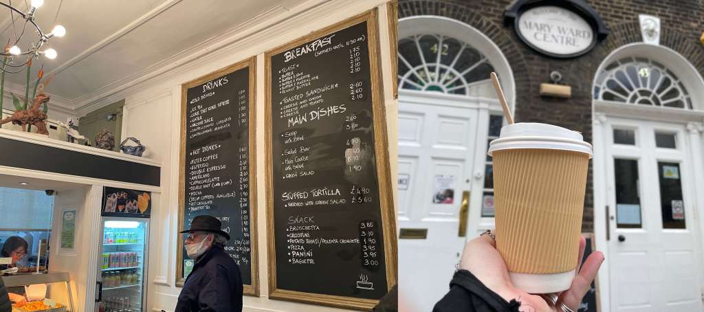 On a miserable day filled with rain and clouds, Bob sought shelter in the Mary Ward cafe and she was so glad she did! This cafe is a little confusing you enter a large ornate door and wind and weave your way through about 6 or 7 other doors. There is no markings just the smell of coffee and food and the loud chatter of the clientele. Once in the room itself there is a lot of seating, a large blackboard on a wall with all the food and drink options and a small deli style counter to order from. I looked at the food which was all vegan/vegetarian but instead stuck with my usual of Black Americano. The coffee was amazing! It didn’t need sugar it was perfect just the way it was.