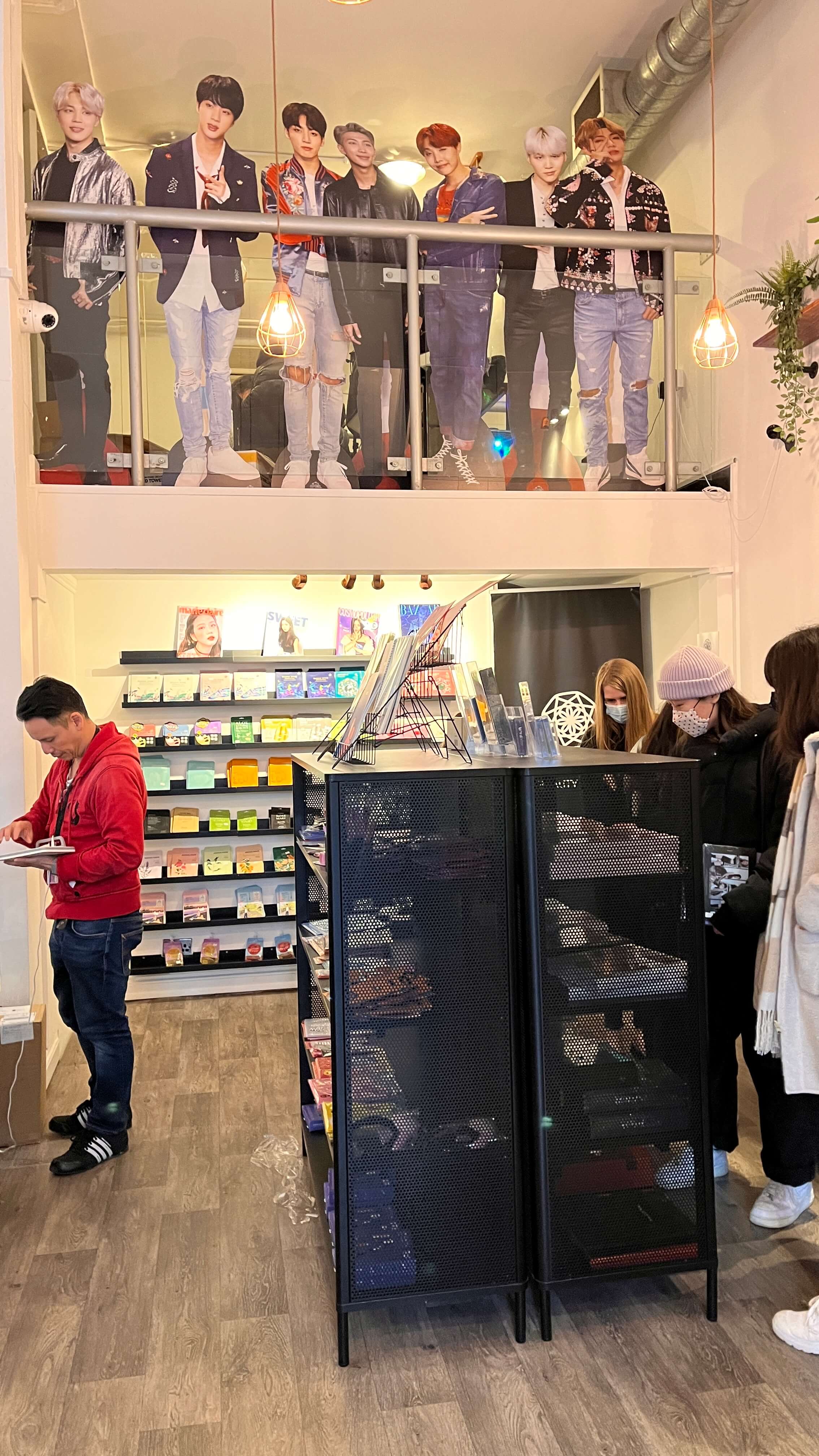 There seems to be an upstairs area, which may have been a coffee shop seating area but was instead with life-size cutouts of the BTS Members, like they had to have this as a statement that they are a KPop Shop!
