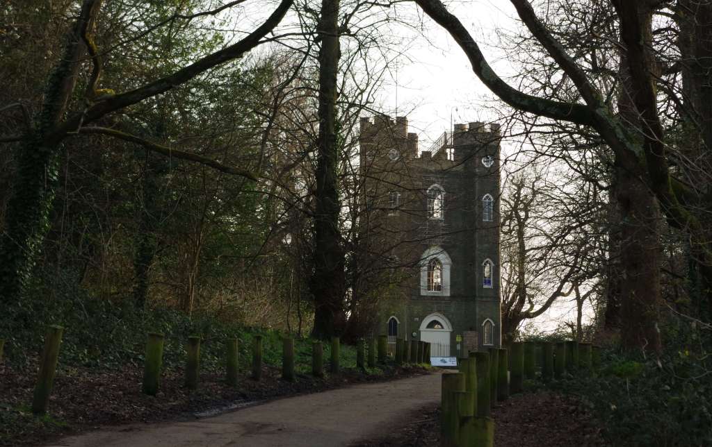 The next section is along the busy road, to the junction and up to Eltham Common and into the woods, there isn’t really a signpost and the path up is a little steep, but is only 3-400m, at the top you approach Sevendroog Castle, a triangular folly, built to commemorate a commander of the East India Company who fought off pirates that threatened the ships of the EIC and owned the land in the 18th. Bob tried to befriend some parrots – given the squirrels were grumpy, but it seems the parrots are just as unfriendly, seemingly screeching a go away at her offer of monkey nuts!