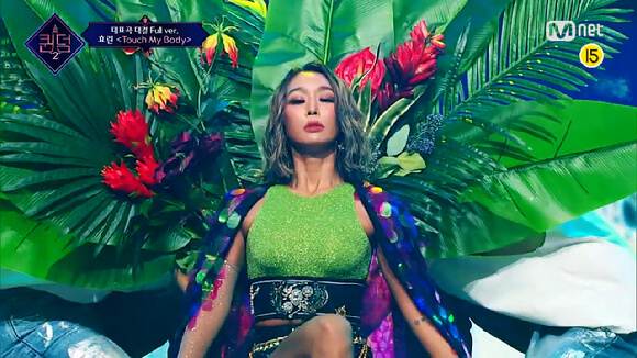 Finally last week’s winner Hyolyn took to the stage and performed Loona’s song ‘So What’ dressed as Catwoman, with a mass on leather clad backing dancers and the pre show video showed Hyolyn working on the production of her track, making it seem like she was the only one to actually produce a track – again MNet favouritism and promoting who they want – Her performance was great though and it seemed to be the best performance, but that was also because the playback was fluid, fewer breaks for reactions of the other bands and when it did break it backed up to show you what you missed, unlike Kep1er’s song which kept missing sections.