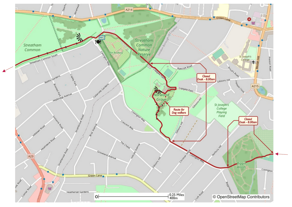The Nature Reserve is the nicest part of the walk, a couple of hundred metres of straight, gravel path through woodlands, a haven for Dog Walkers, before you get to Streatham Common, where the guide tells you once again to stick to the road and avoid the common ground – which of course we ignored and walked across the grass.