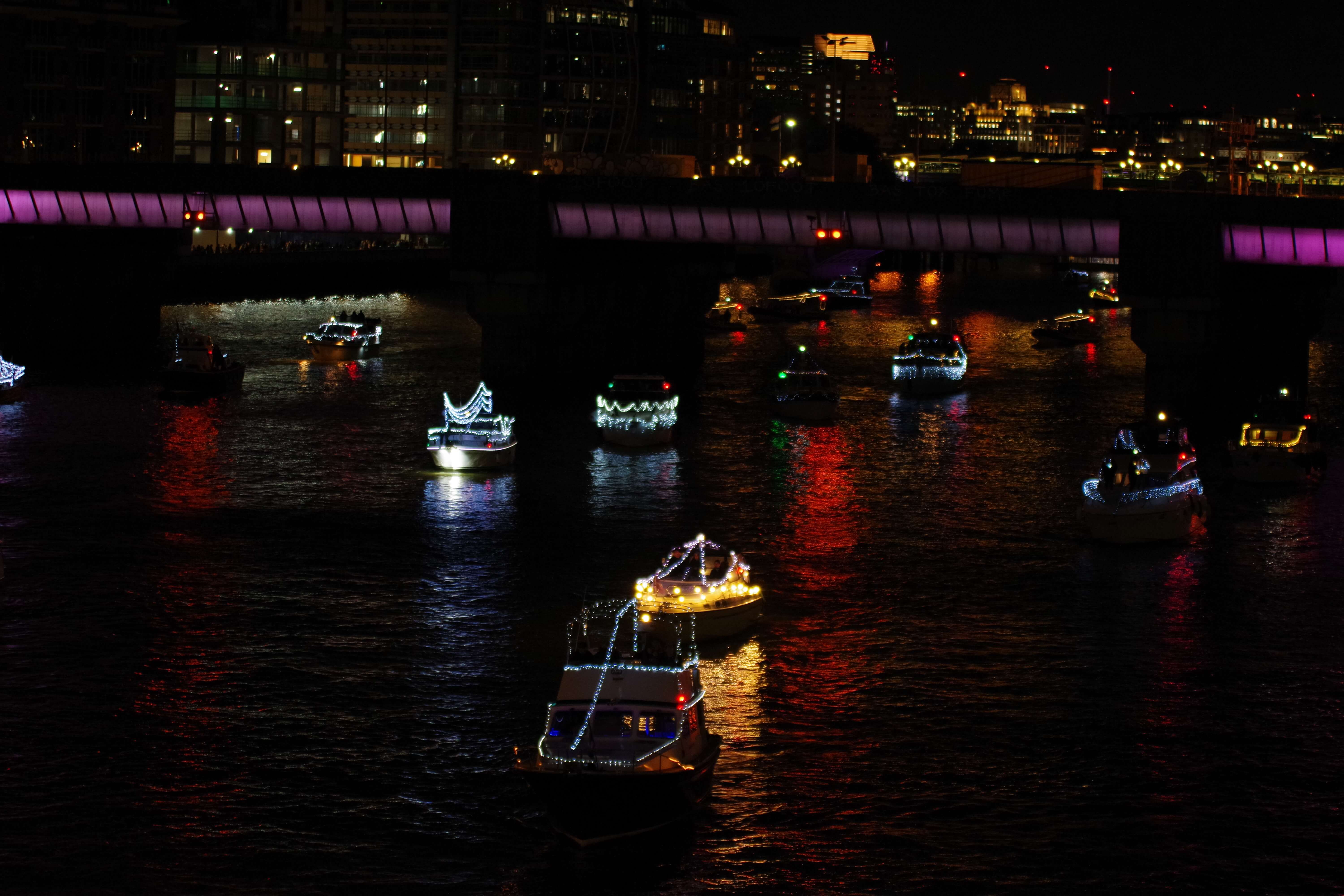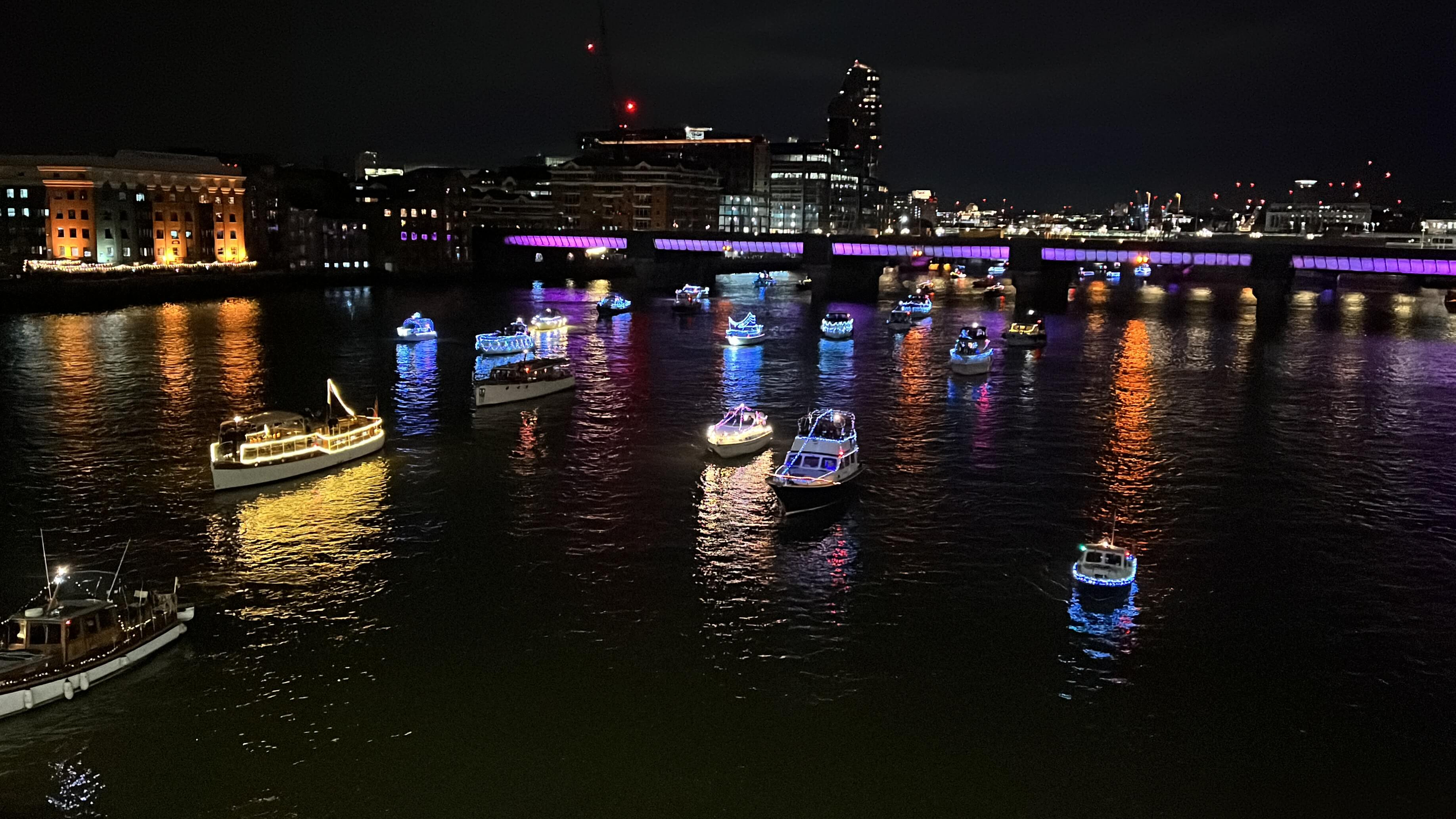 We on the East side however got a full view as each vessel passed under Cannon St Rail Bridge, illuminated in a rainbow of colour and reflecting on the blackened water, creating a stunning sight and a nice long view of each craft all decked out in lights and many crowded with people all waving and enjoying their time on the water, even if they all looked decidedly freezing!!