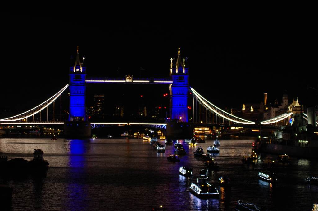 The end of the Flotilla saw the great counter-levered arches raise up in a silent salute to the vessels – usually the bridge only raises these days for ships with high masts and multiple decks, those that need the extra room to get through – but on Saturday night the bridge closed the roads and lifted to accept the leisure craft that pottered under the blue wrought iron facade and glass viewing platform high above.