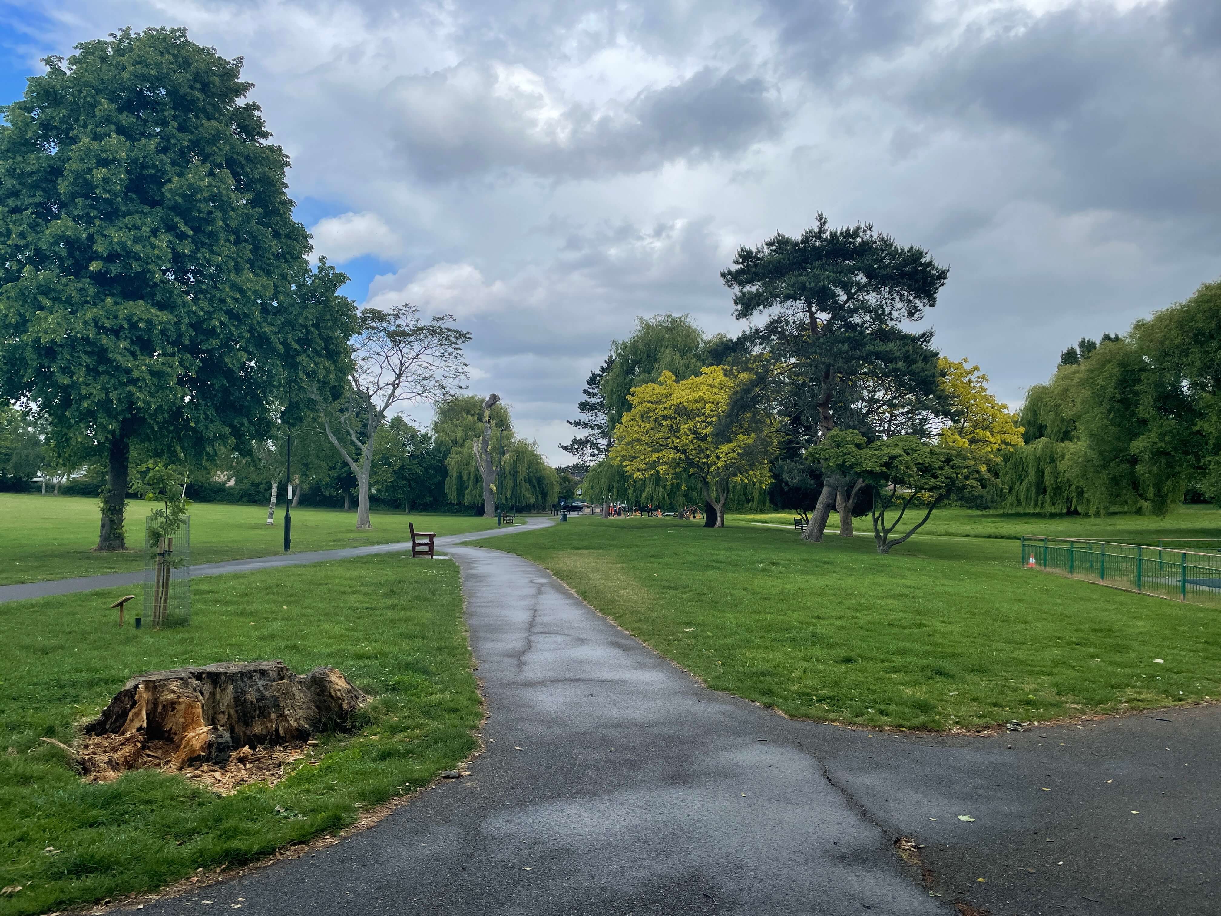 A short walk along the roads before turning into another park and along lush lawns and pleasant gardens, tennis courts and the pretty stream between more of HGS homes, across roads that run off the A1. Then into Lyttelton Playing Fields, where we took a little break and contemplated coffee from the cafe but we had a plan and so left it in favour of…