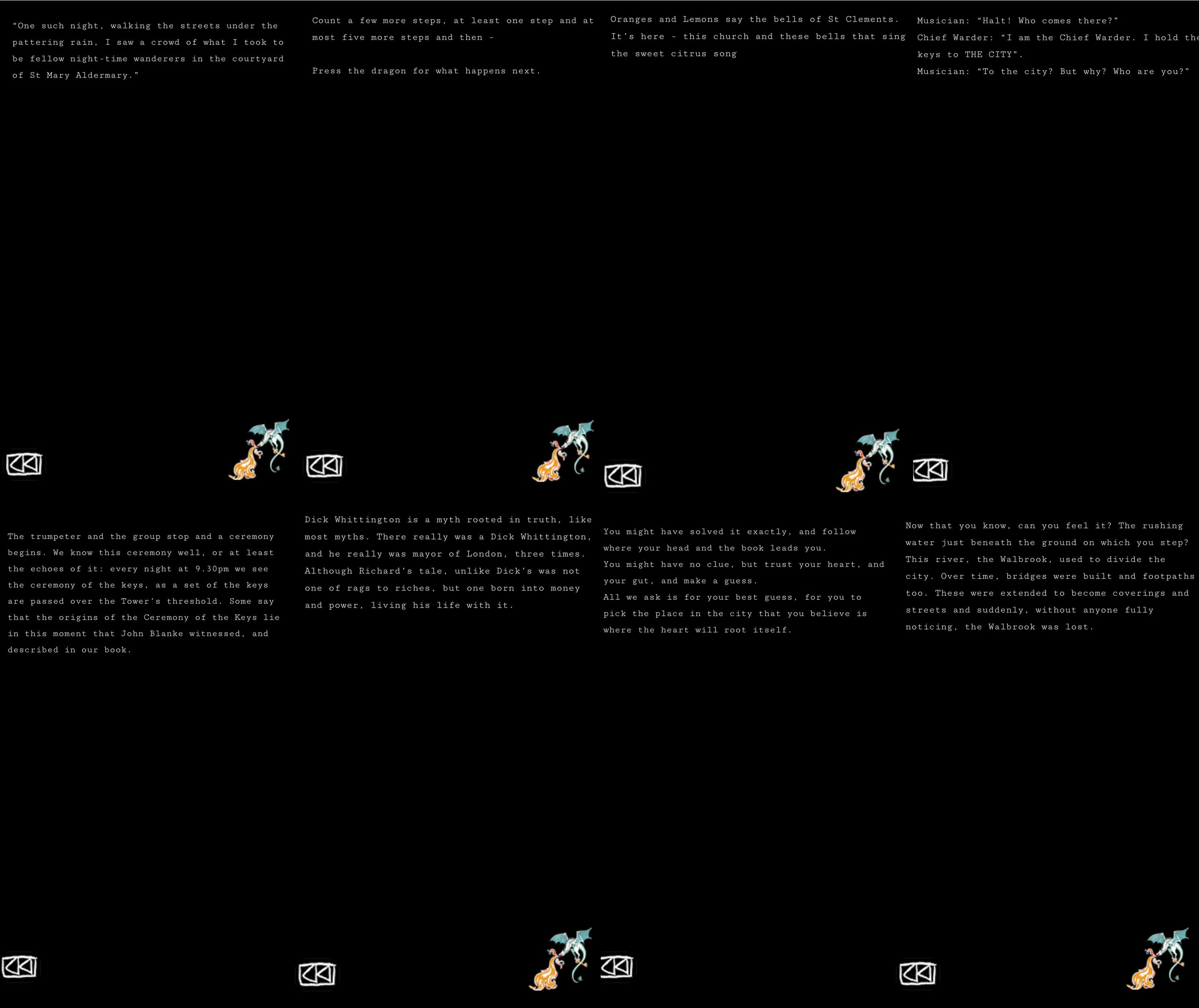 There was a word on a sign in between columns (Serendipity) we texted that and then the clues waffled on about Dick Whittington and stories etc.