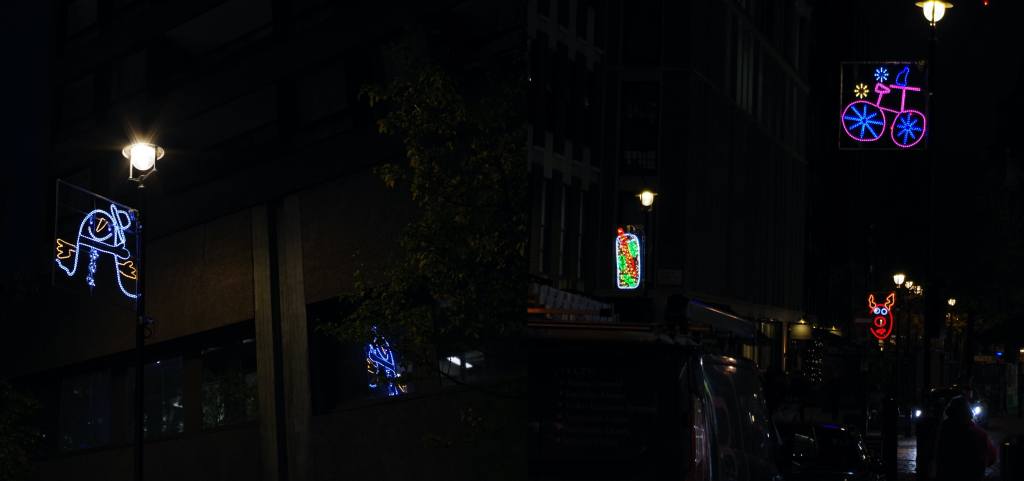Finally into Carnaby Street and some actual lights hanging across the famous walkway, but it seems though bright and colourful, these all look pretty familiar to viewers of previous years and that’s because all the decorations are left overs of previous year’s offerings. Kingley Court and the other side roads (Garton & Faubert’s St) offered much the lights as always.