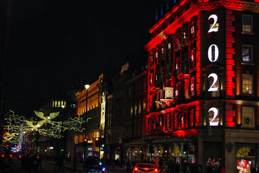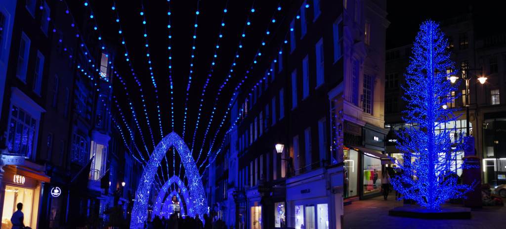 Then it was time for the timeless elegance of South Molton Street, the pedestrian road, with the exclusive boutiques and tailors is all a blue glow, from angelic arches and strings of deep blue lights, to giant blue trees at either end, making for a picturesque view along its length. At the end we spotted the giant white and gold chandeliers of Bond St, Fenwick’s and the start of the exclusive and more expensive streets of the West End, Some of these went to town on their exterior decor, Chopard’s, Dior, Chanel and Tiffany, made a real effort, whereas Burberry and Ralph Lauren were seriously lacking in their festive cheer.