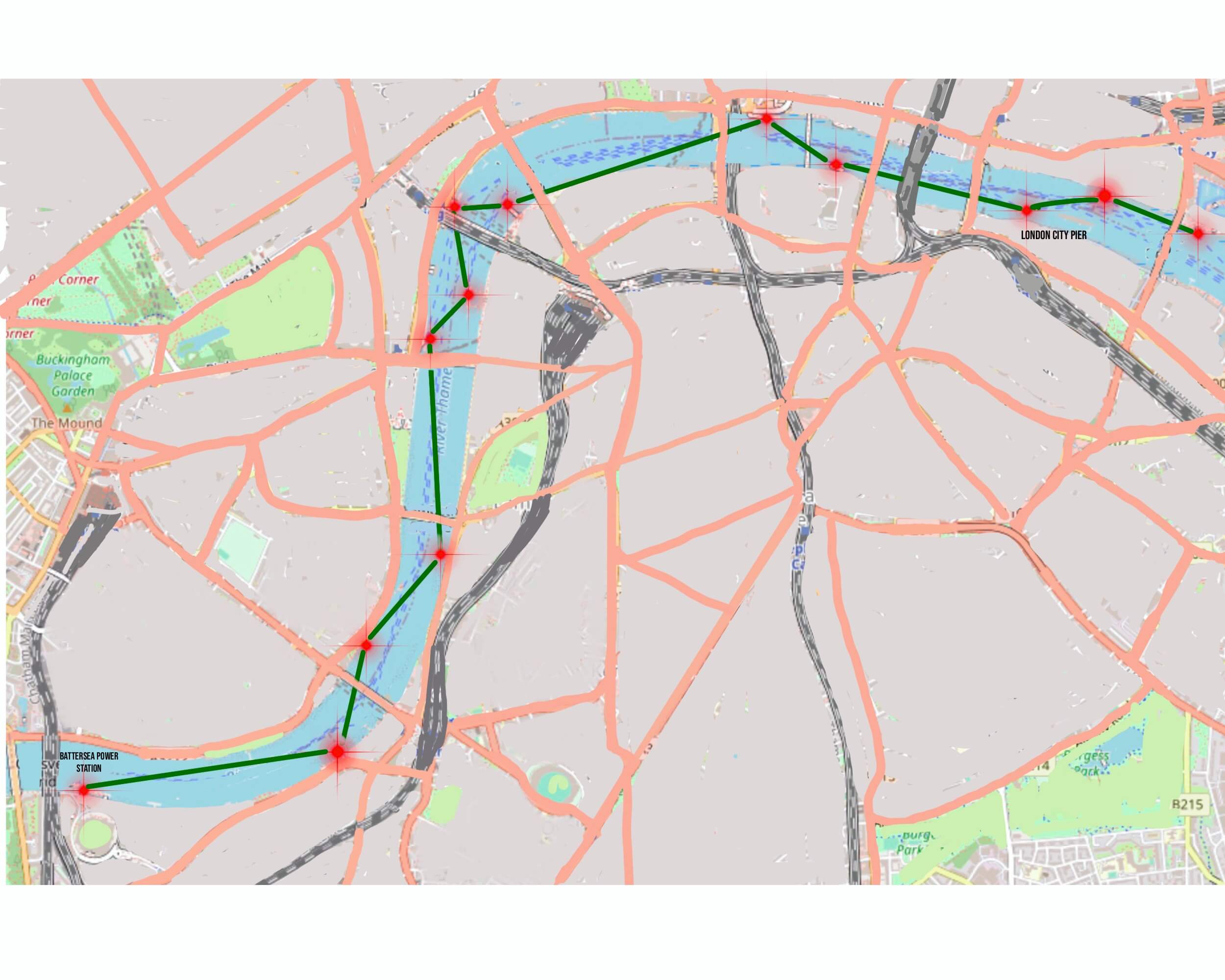 2.5minutes across the river to Embankment Pier, under Hungerford Bridge, yes another 5 minute walk or 20 minutes total travel time on a boat!.