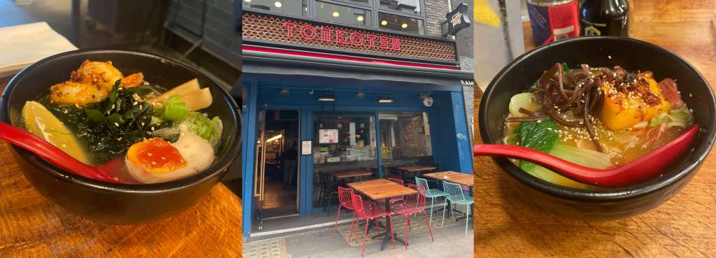 Here we found a quiet space and tried the dice again, this time for food, we needed lunch and the junction of Cambridge Circus gave us a range of options, using an 8-sided dice to give a better throw, we picked directions doubling up on N-towards Tottenham Court Road, E- to Covent Garden, S back towards Piccadilly and Chinatown, or W- into Soho and threw a 7 to send us west into Soho in search of the first Veggie friendly, in budget (£15pp) restaurant. After a few minutes of discounting pubs and coffee shops, meat-sentric burger bars and the like we found a Tonkotsu in Dean Street, the Japanese Restaurant chain was an easy choice for a quick stop.