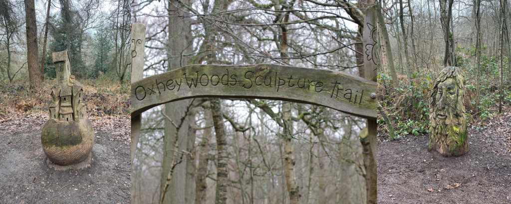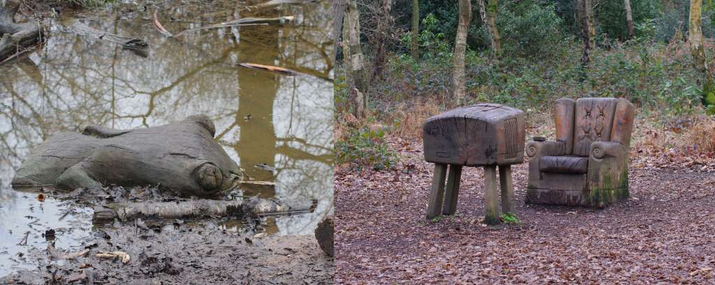 Along the path you will spot a sculpture of a house, this is the first of many if you take the shown detour – The Oxhey Woods Sculpture Trail. This is the highlight of this section – spot the frog in the pond, the old TV and Armchair, the Green Man’s Face and many more before returning to the start and exiting into South Oxhey Woods and then onto Oxhey Drive.