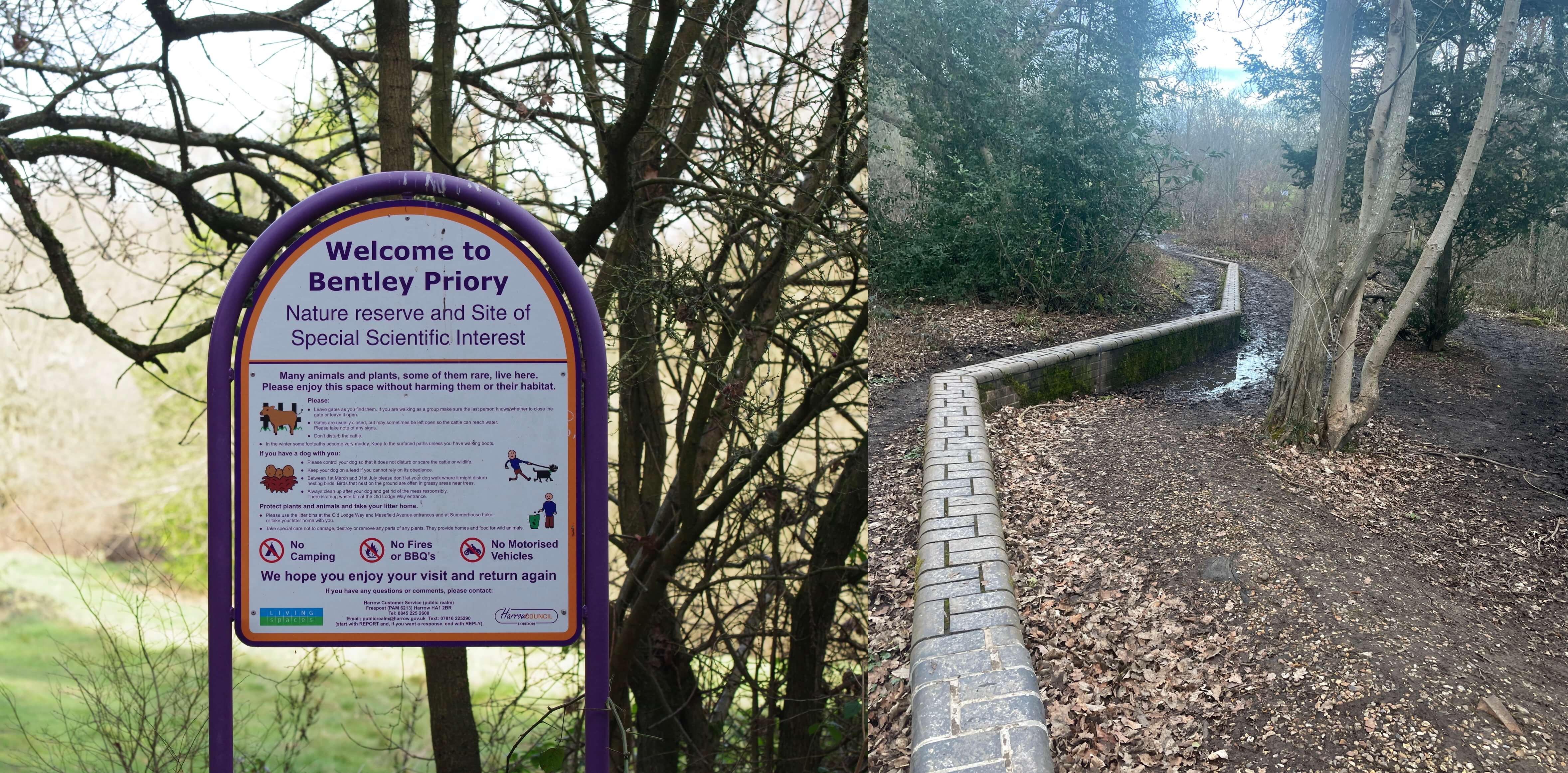 Cross this road (quickly in-between the traffic) and through a gate onto another footpath alongside a retirement home. The track opens onto the former Bentley Priory grounds.
