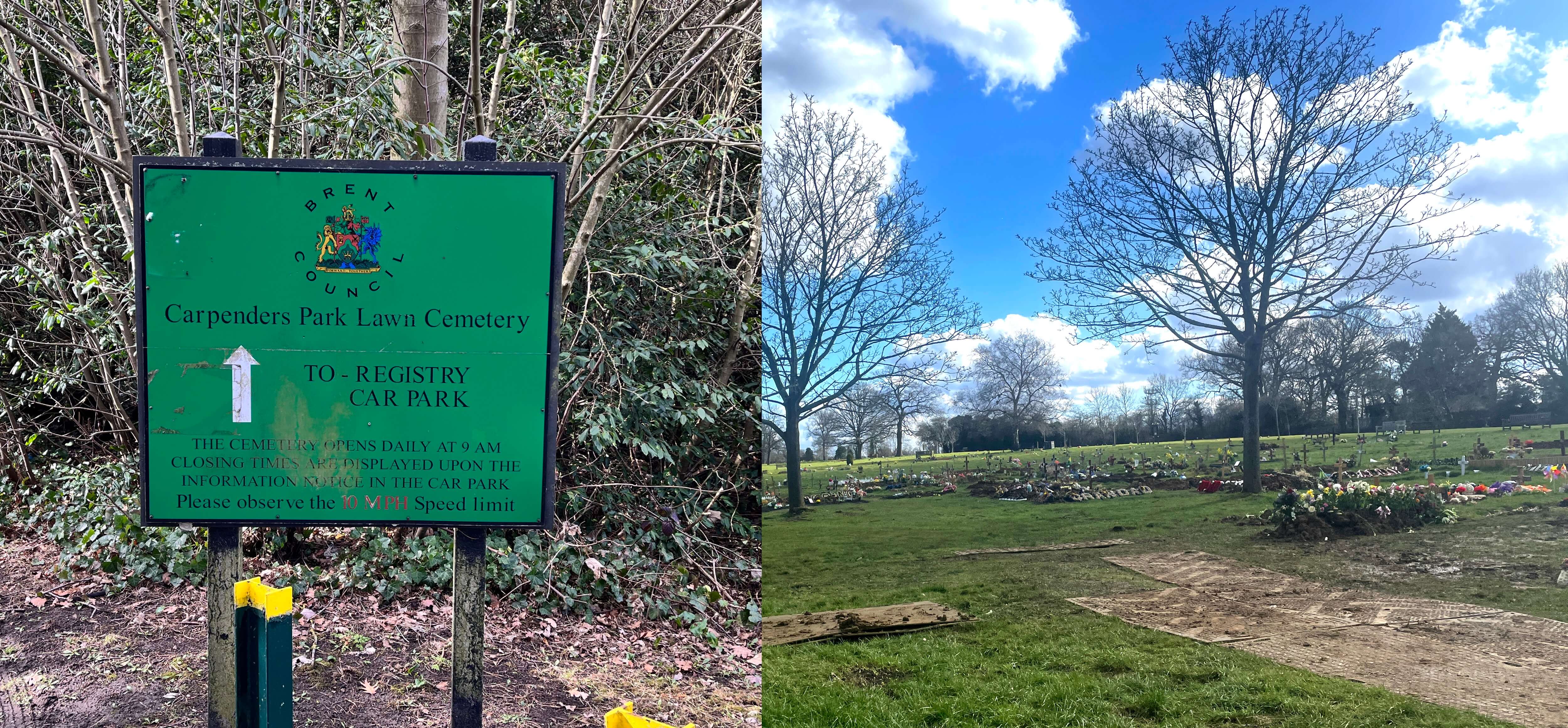 So with the untouched coffees in hand we followed the road around to an alleyway between houses heading for Carpender’s Park Lawn Cemetery. This public footpath is quite pretty – huge trees and a stream winding around the backs of houses, opening up to a pretty pond and waterfalls. We stopped for a moment to let the invalid dog have a run around and for us to drink the coffees, thus proving you should never believe what you read in those Google Reviews. Truly one of the worst coffees we have ever been unfortunate enough to suffer and we couldn’t find a bin quick enough!