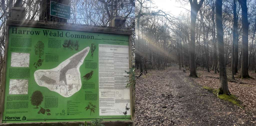 There should be another lake here but it had been drained due to an ‘Invasive Plant’ so instead you can head down to the Old Redding Road and the ‘Good View’ of London, or just continue on around and under the Grim’s Dyke Hotel’s grounds and head east. Up and down some more steep hills, passing around the garden centre and on towards Harrow Wield Common, this is in fact just more of the same woods, but after a while your route runs alongside a busy A-road before climbing a set of steps lead up to and over the Common Road.