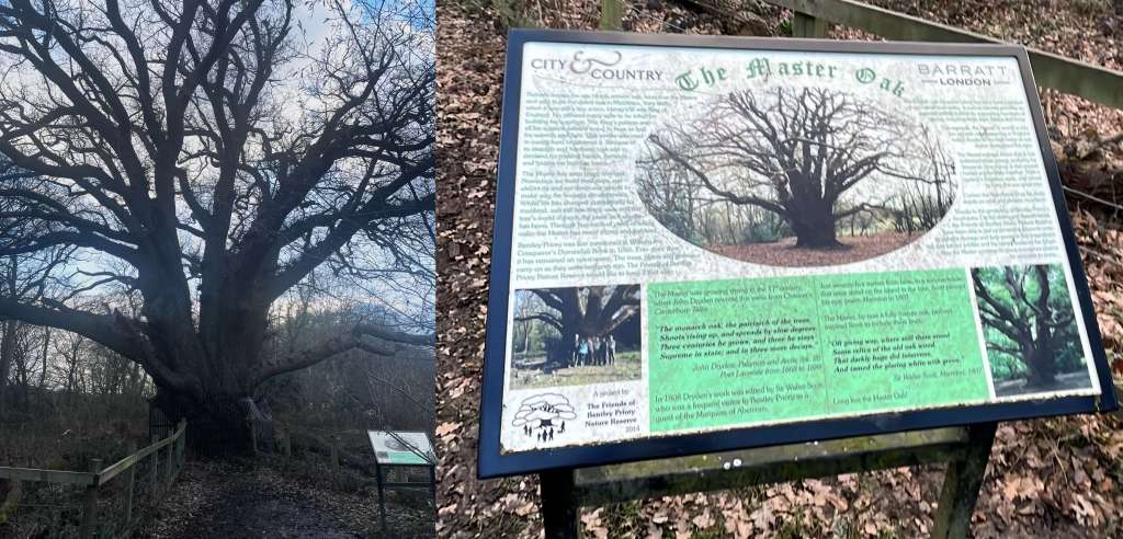 The ground was a mess and we took to walking along a random 1 metre high wall that zigzags along the track, rather than fight through the mire, stopping to view The Master, not an adversary of the Doctor but, the oldest tree in Middlesex Apparently and to rescue a lost teddy bear!
