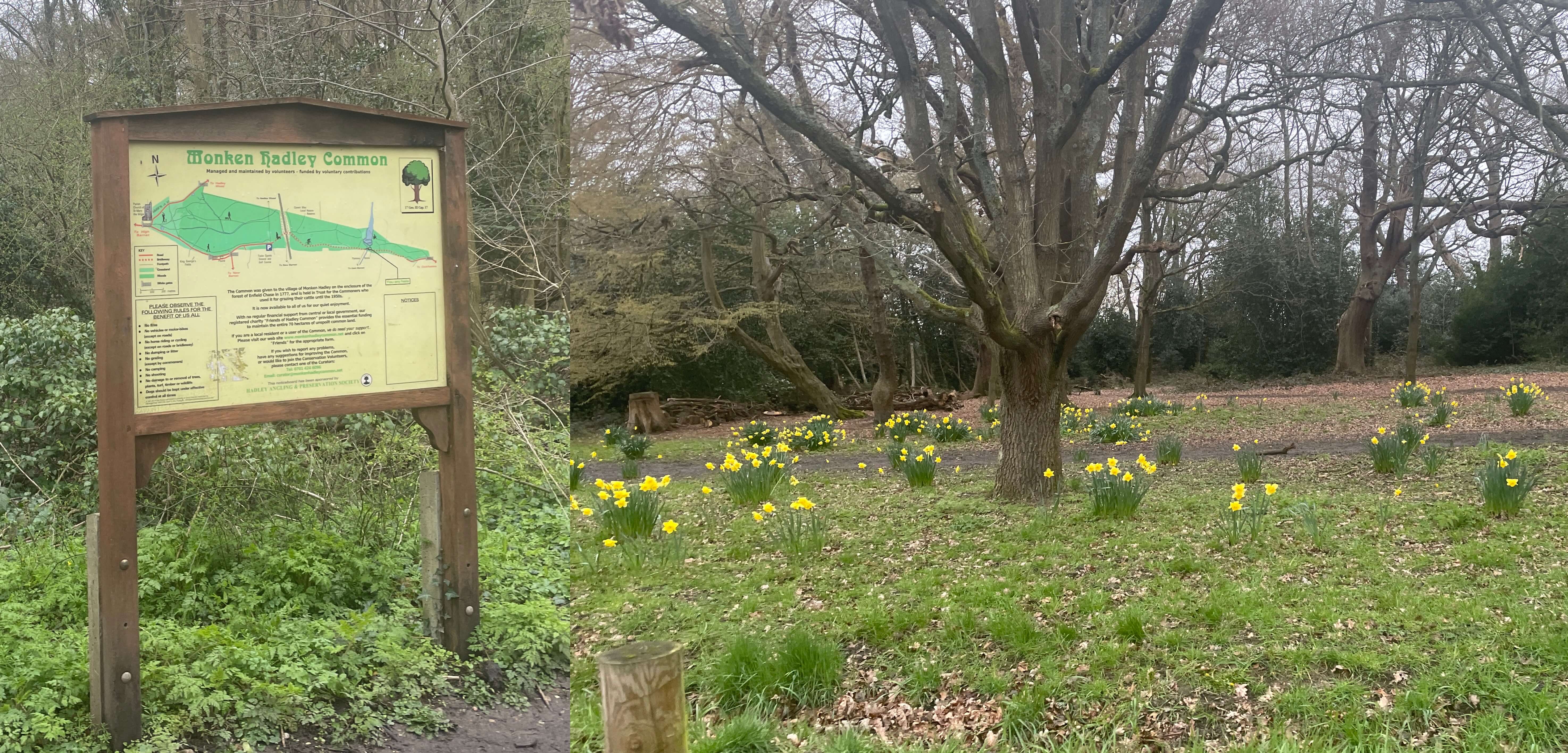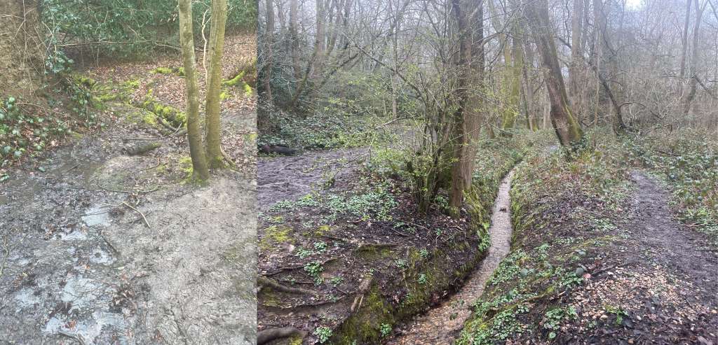 Follow the footpath out alongside the private gardens and cross Hadley Common and into Hadley Woods, again check the choice of route dependent on Dry or Wet conditions and mind the streams and brooks that criss-cross the path and don’t fall in (unlike Ash!)