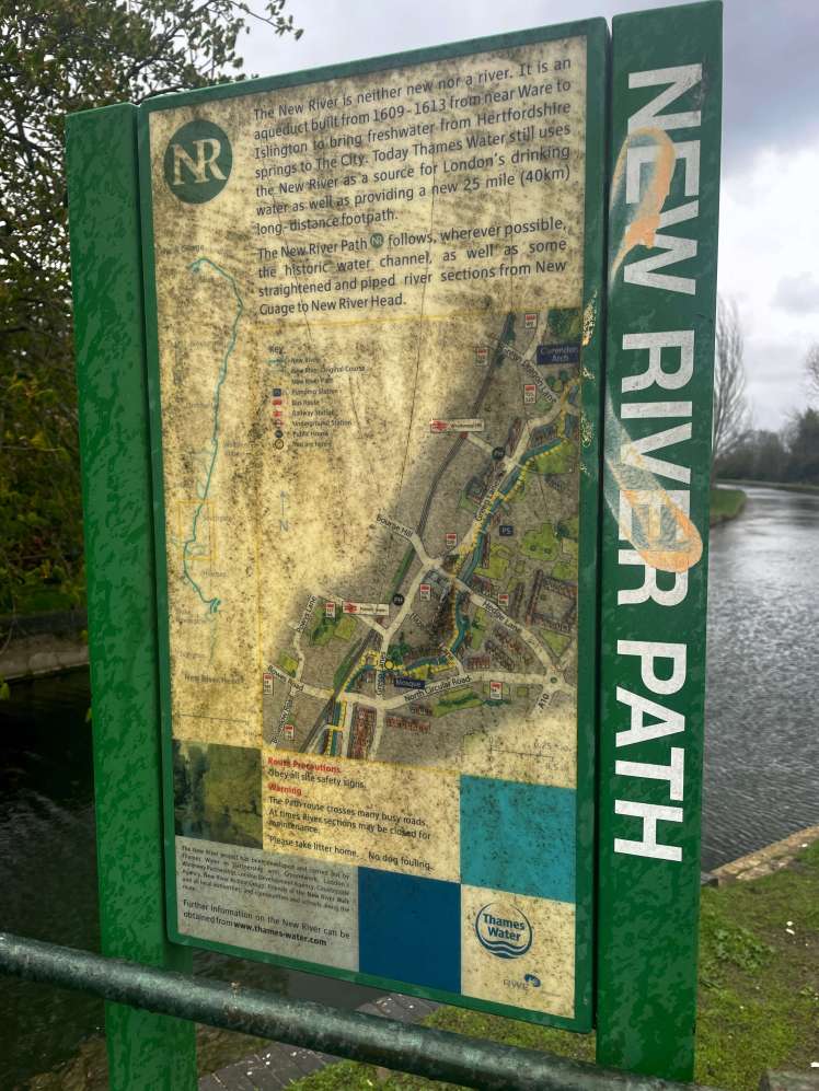 The New River is neither New or a River actually, it is however a Water Filtration conduit that brought fresh water to the centre of London from Bedfordshire and was built by Sir Hugh Myddleton in 1613 and now is a nature walk and home to flora and fauna aplenty.