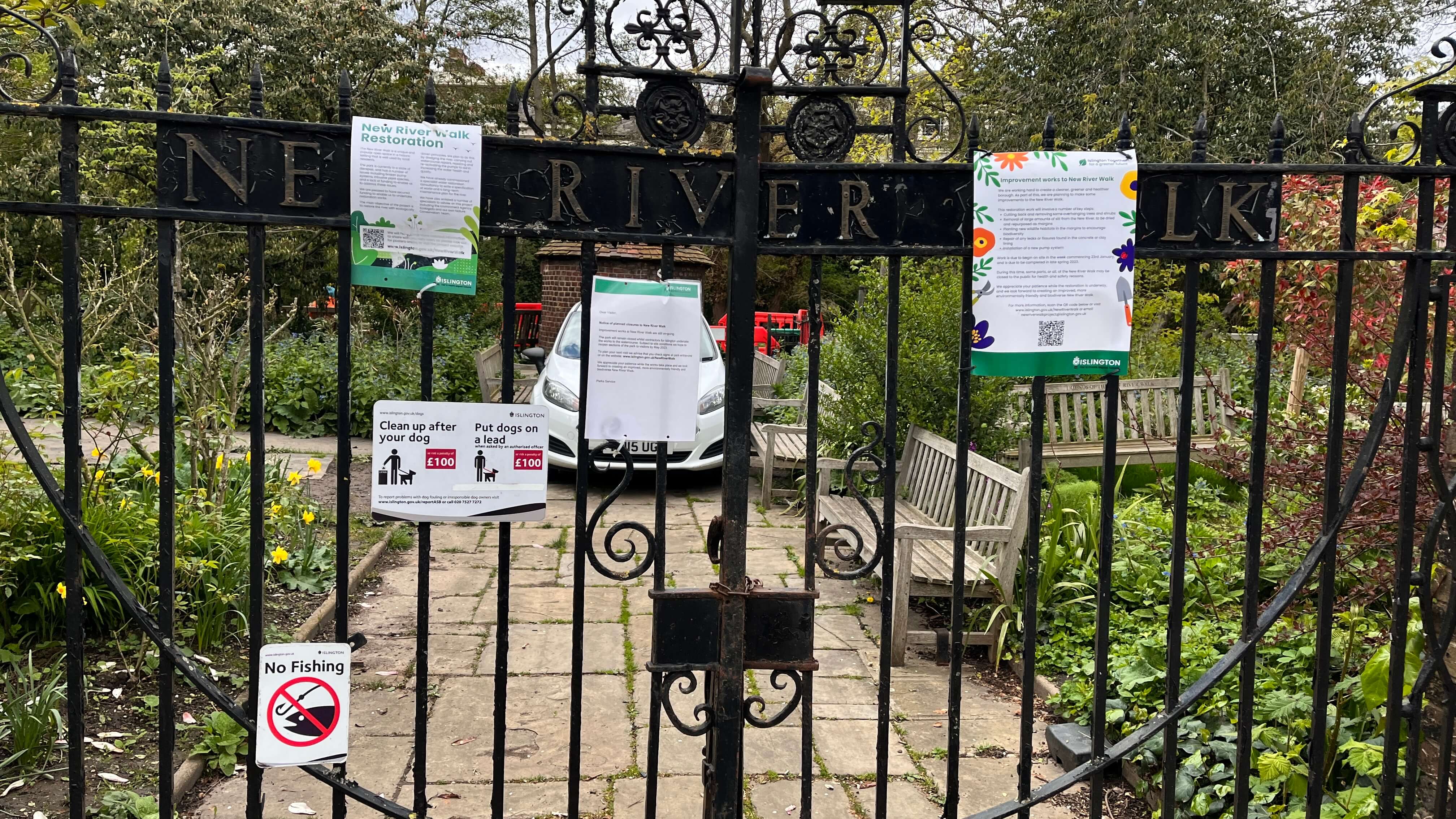 Before World War 2 there was a bridge here and the NR followed the road inside the park, turning under the road and up Aden Terrace, but a V2 bomb changed all that and these days the river runs along under allotments that now fill the space, this is the path you take too. At the top end of the communal gardens emerge back on Green Lanes, cross it and follow Petherton Road.