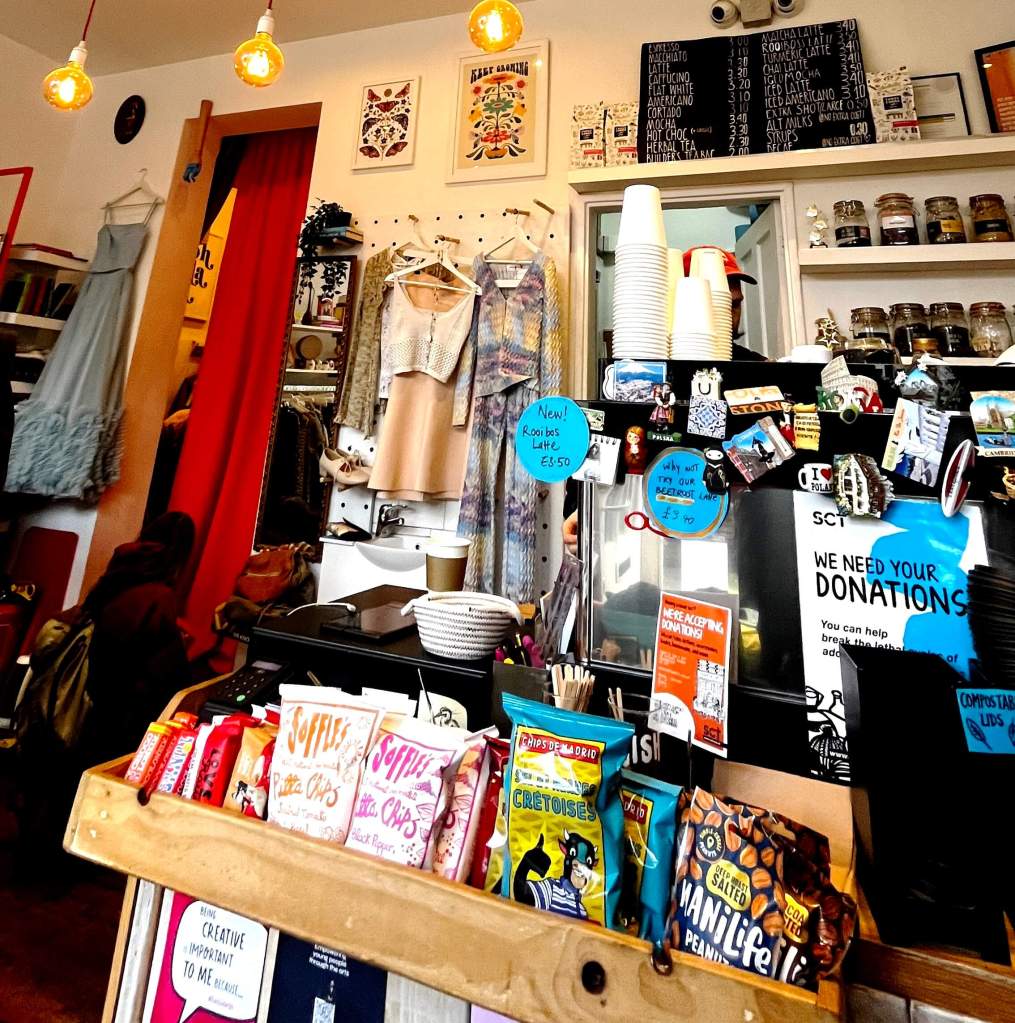 A Strange little shop for it isn’t a coffee shop, but a second hand/trendy resale sale with a guy with a handlebar moustache juggling large rings in the corner! But they also have a coffee machine.
