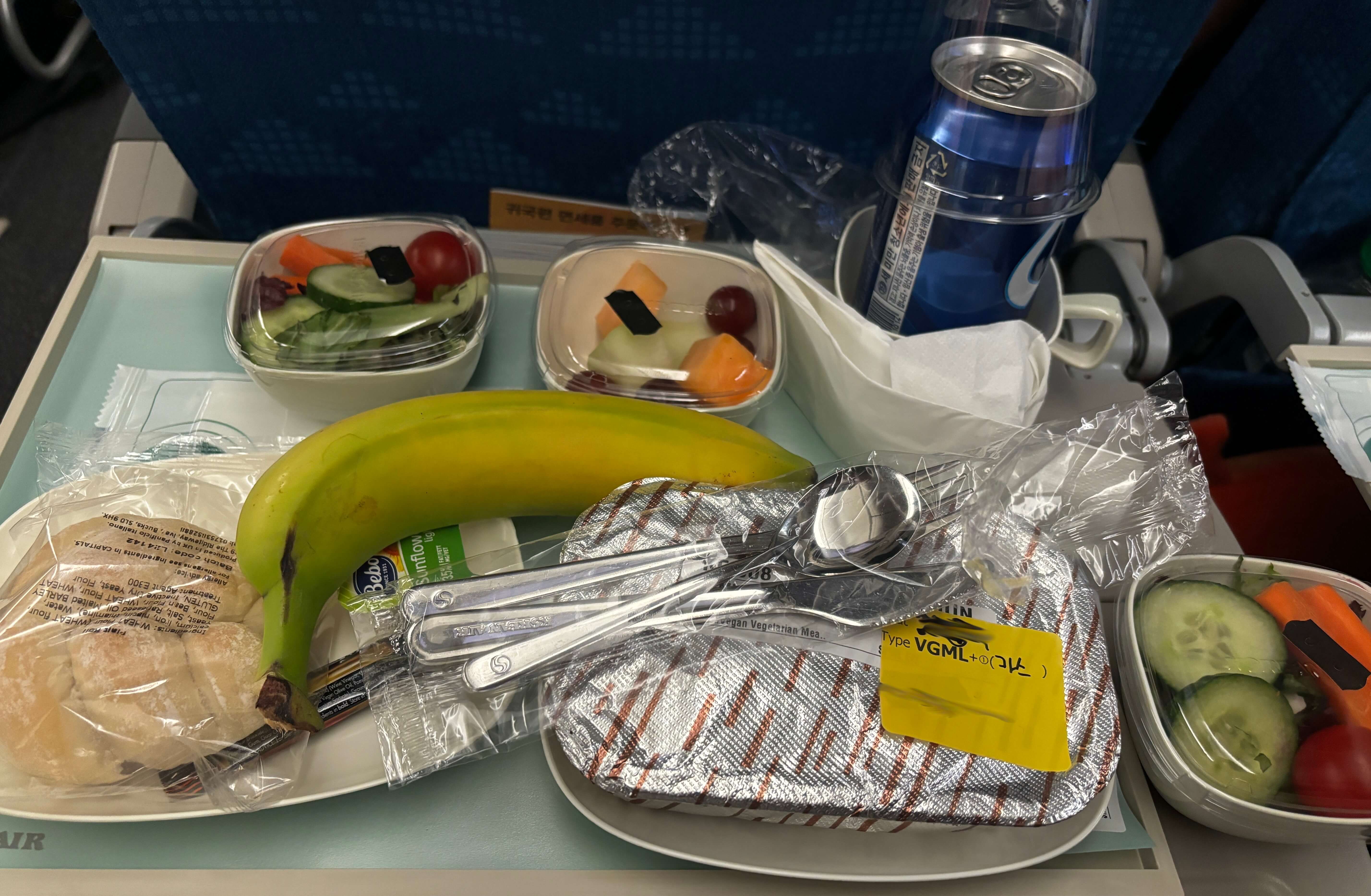 Yeeeeeah… don’t do that! The Vegan option is basically rice! The main meal consisted of a couple of segments of fruit (apple and Orange) then a bread roll with sunflower butter and a Corgette rice thing with balsamic vinegar?! The Koreans do struggle with veganism at times and here they seemed to just do rice and a bit of fruit – it seemed as though they rushed around trying to find anything that was vegan regardless of what it was or whether it went with the meal (A couple of sachets of Sugar?) The girl to side of us got the full Korean menu option with multiple sides and random extras – so we quickly realised there is no point trying to book special meals. She had Tofu Curry, Ramen, and Soy milk in tea, Ash didn’t get milk of any sort and the main meal was inedible (I can’t remember what it was).
