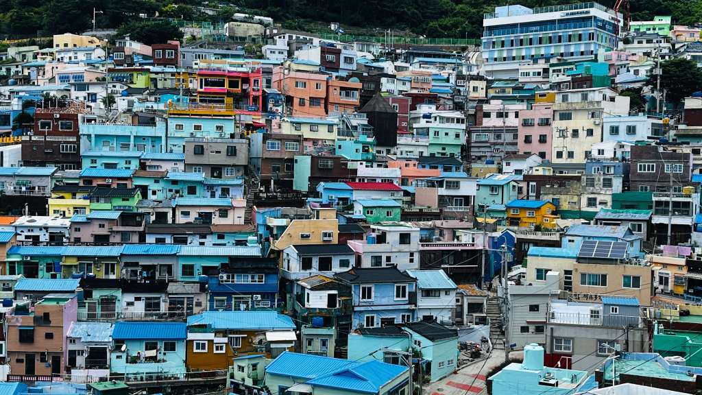 We headed to Gamcheon Cultural Village via 2 buses – the second a tiny 10 seater driven up windy country roads so steep it seemed impossible. But the little bus did it with ease, depositing us on a hillside road overlooking the village. A mass of small houses all painted bright colours and the weaving streets were filled with Koreans and Westerners alike in Hanbok (Traditional dress) and taking in the steep roads, the little boutiques and shops, getting iced coffee and ice cream, sweets and other treats and taking 90,000 selfies. Koreans do love a selfie – but it’s not as annoying as others- maybe because it’s so normal and no one screams or make a fuss, it’s just a quick snap and on you go to the next photo op!