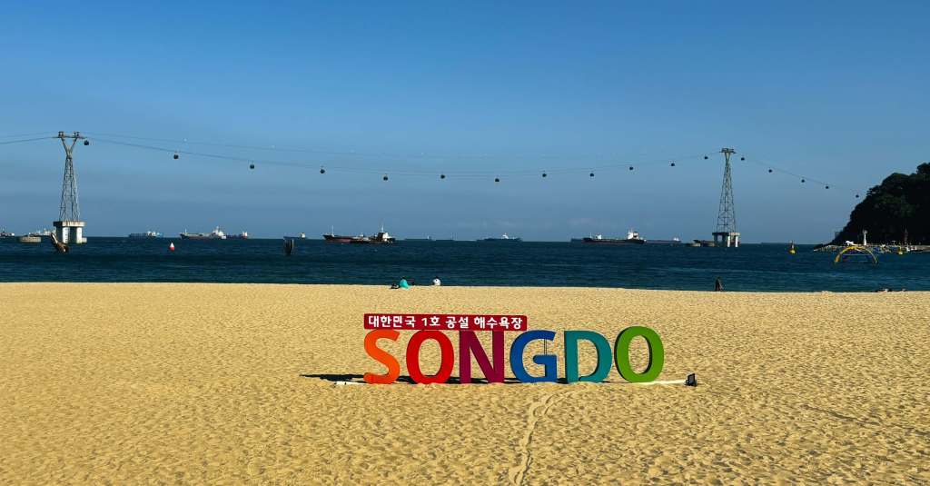 Songdo Beach is the quintessential sandy beach, a deep void of yellow soft sand leading to a shallow sea, that though cold is not as cold as say Spain! (Is anything as cold as Spain?!) While the locals perform a strange daily ritual of covering their entire bodies in clothing (except their feet for some reason) and walk back and forth along the shore, sweating and stomping around. We however took to the water – slowly in some cases, plunging in and bracing the chill in others – and swam a while. It’s not a holiday if you don’t go swimming, is it? After a while of water and sun, sitting watching the traversing Songdoites, the expensive cable car crossing the cove and drawing the vista in our sketchpads, we took a wander along the promenade and went to the wonky bridge. From the viewpoint on the beach the bridge in the distance looked twisted and oddly spaced. Once on the Skywalk you realised why, it’s a twisting, turning route over the sea, with mesh and wooden flooring to give a view of the water below, while the wind tries it’s hardest to push you in. Halfway along it there is a strange construction, a fake cave and a statue of The Little Mermaid.
