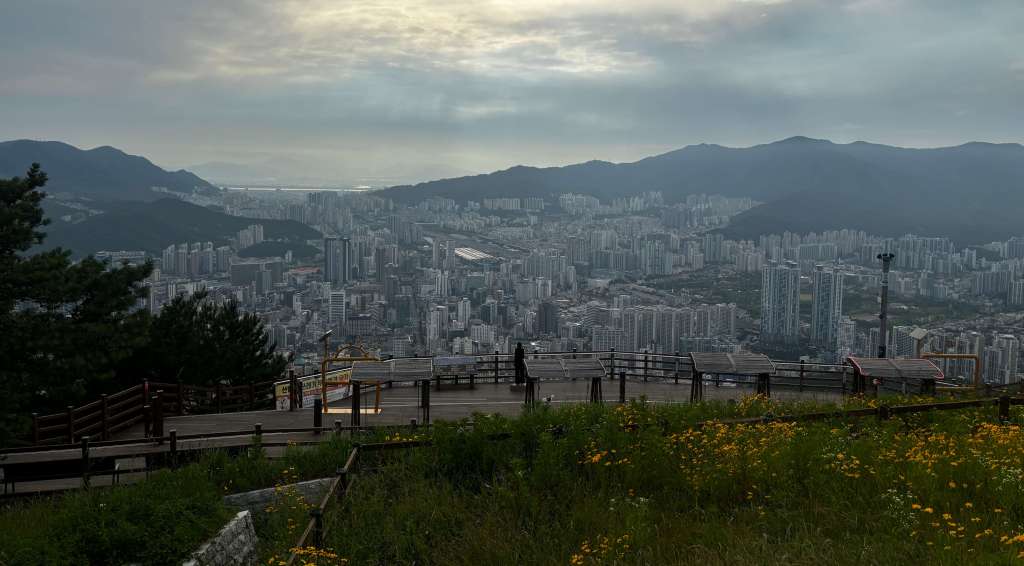 Our goal the Hwangnyeong Mountain Observatory and a famous view of the city. We took the little hill climbing bus as far as it went then set off up a steeeeeeeep hill towards the summit. Detouring to another magnificent Buddhist Temple and one that looked familiar to K-Drama watchers, the hideout of Han So-hee’s adopted father in My Name. After admiring the temple we set off on our mission, climbing the steep road and paths towards the top, a few rests and stops to admire the growing view and then after a brief stop for water and to ponder the need for another gym atop the mountain, we reached the observatory.