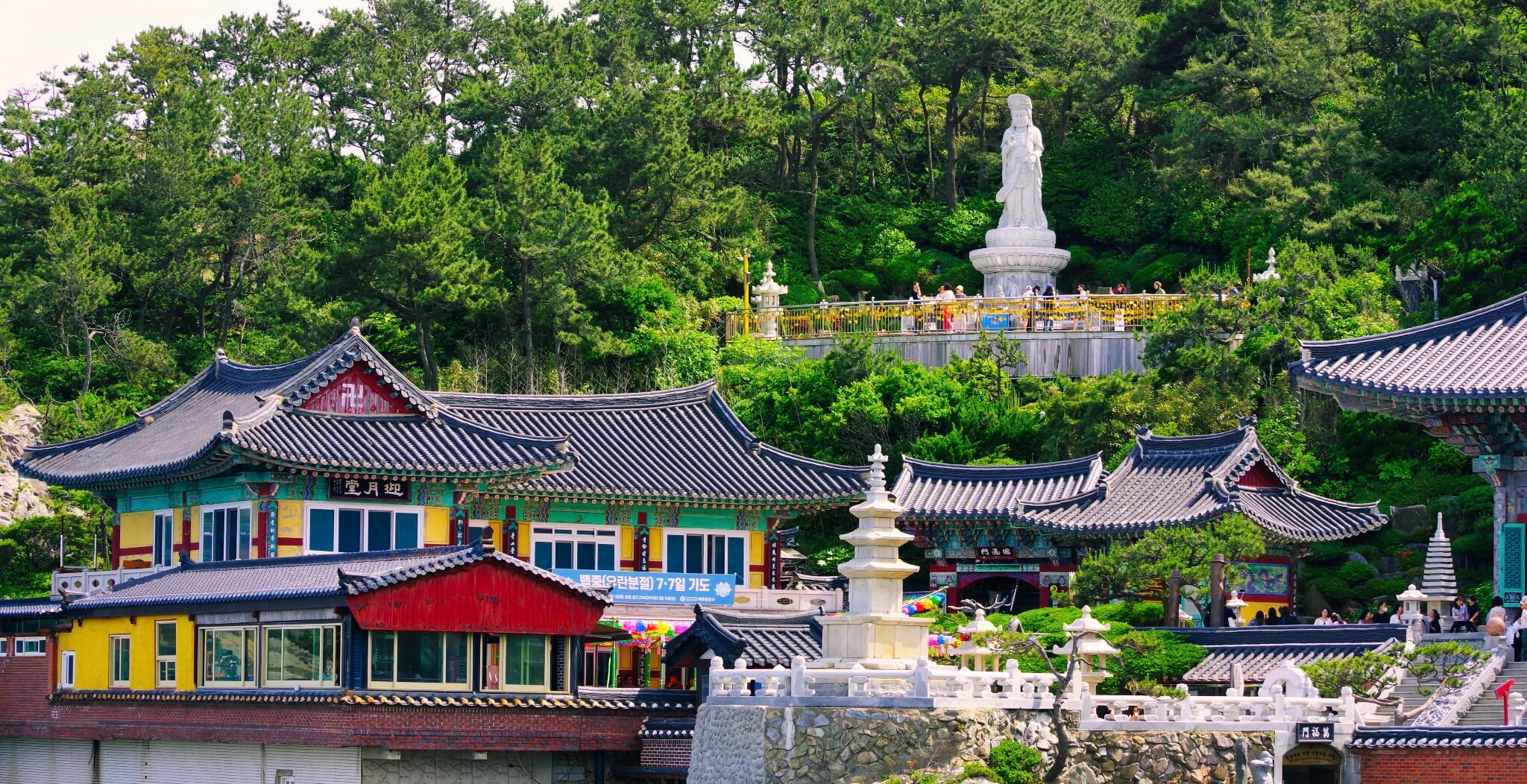 Our destination Haedong Yonggungsa Temple, a 14th Century Zen Buddhist Temple. The bus deposited us and a mass of other tourists as well as a few natives at the side of a hilly, winding road and we started to trek. The walk took about 10 minutes and would have been quicker if we weren’t stuck on the narrow pavement behind a group of gravity affected Italians – why is it European Tourists always walk so slowly? Even in Oxford Street, they seem to struggle with walking at anything other than snail’s pace. But after weaving and eluding them we found a massive car park and a row of tourist trap kiosks and shops selling fake ‘Real Korean Artefacts’ and a ton of actual local Korea Street food, but we held off on those till later, instead we followed the path to the gates of the temple and the row of statues of Deities. The Chinese Zodiac type, human like figures with the head of a pig, goat, chicken, cow, etc as well as other monoliths and a massive gate leading down old stone stairs.