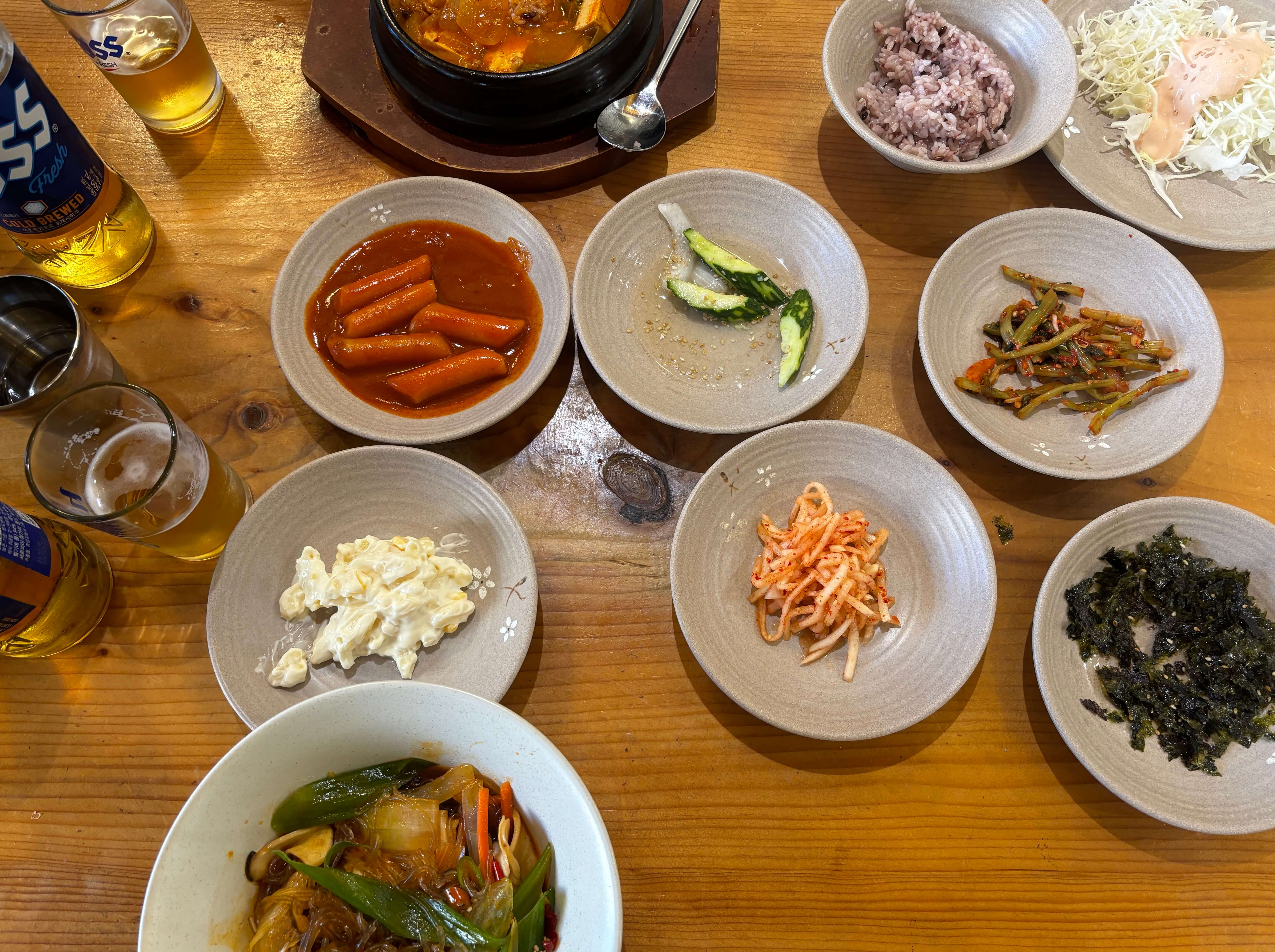 A Korean Restaurant nestled in one of the side roads with a cool view of the market below. We ordered One Vegan Japchae (Cold Glass Noodles) and Beef Doenjang jjigae (A Beef Spicy Stew) that came with vegan Banchan (Side dishes).