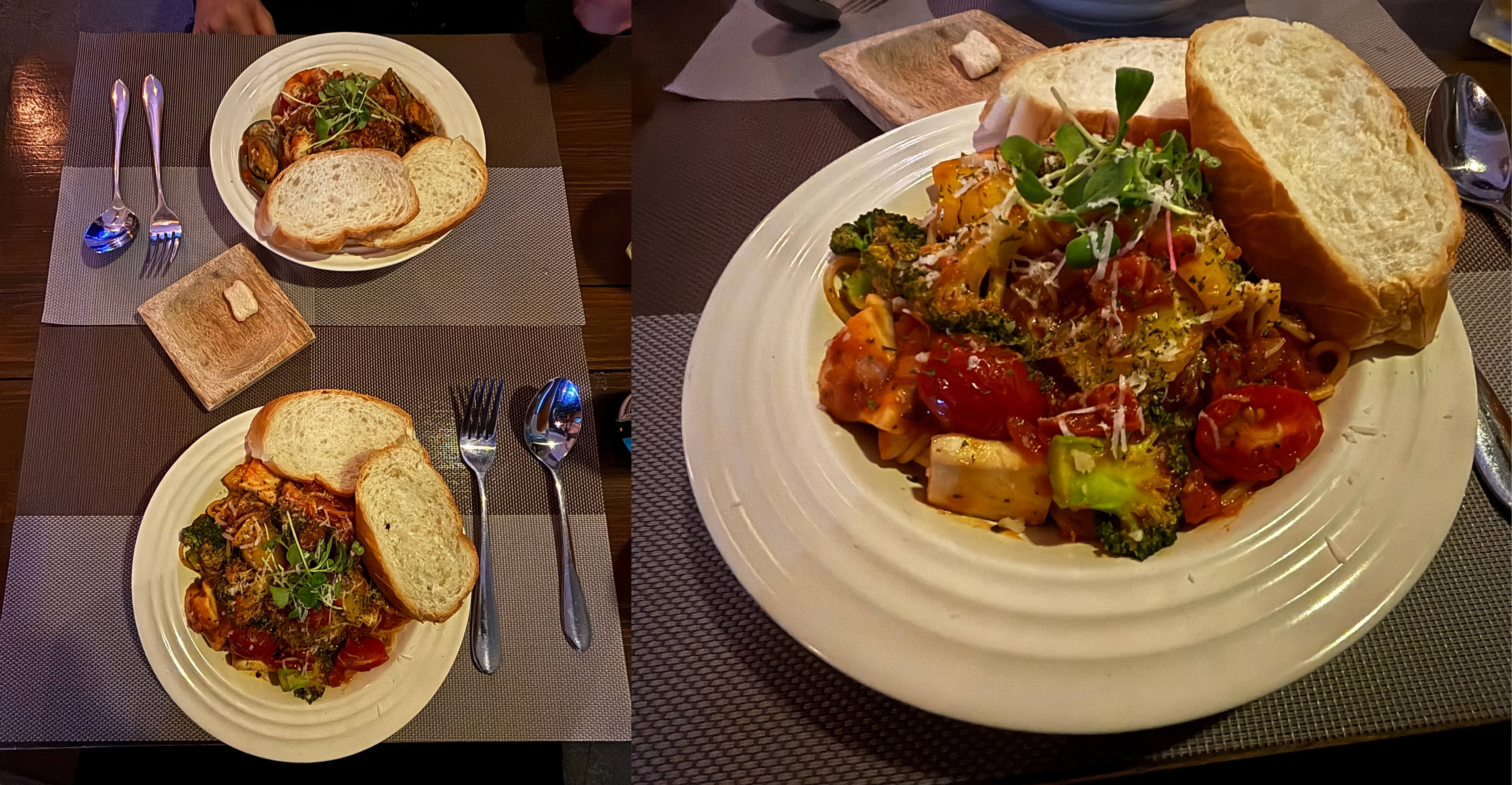 Bob had Chickpea Steak and vegetables – which was so good, a little dry with the patties but the sauce made up for that.